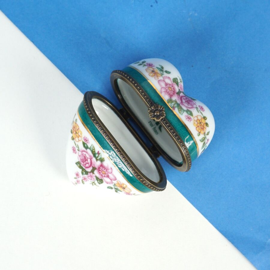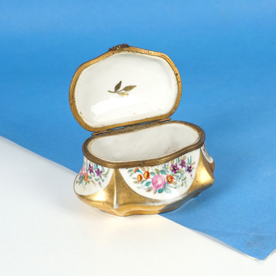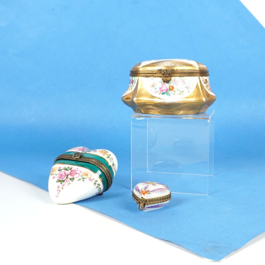 Ensemble de trois boîtes en porcelaine émaillée polychrome à décor de bouquets de fleurs, première moitié du 20ème siècle, L. 4 cm, 7.5 cm et 11 cm.