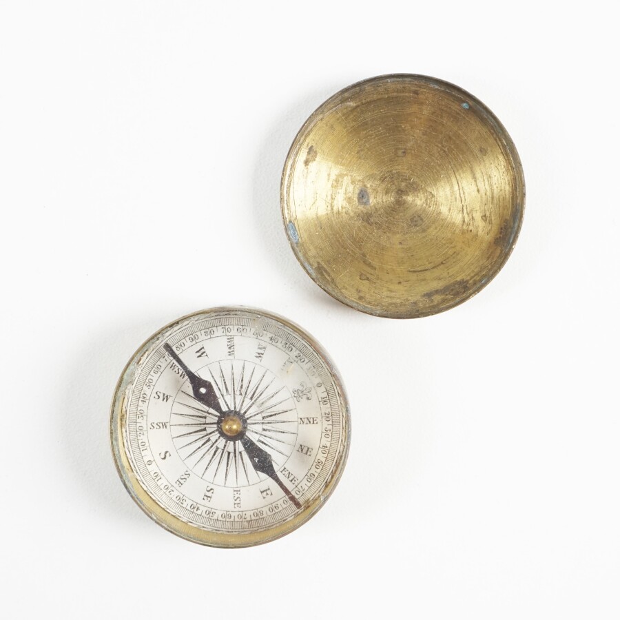 Ensemble de trois éléments de mesure comprenant thermomètre (sans mercure), boussole, habitacle laiton et niveau dans son coffret en cuir noir, H. Thermomètre : 19.5 cm. Diam. Boussole : 4.3 cm. L. Niveau : 11 cm (usures).