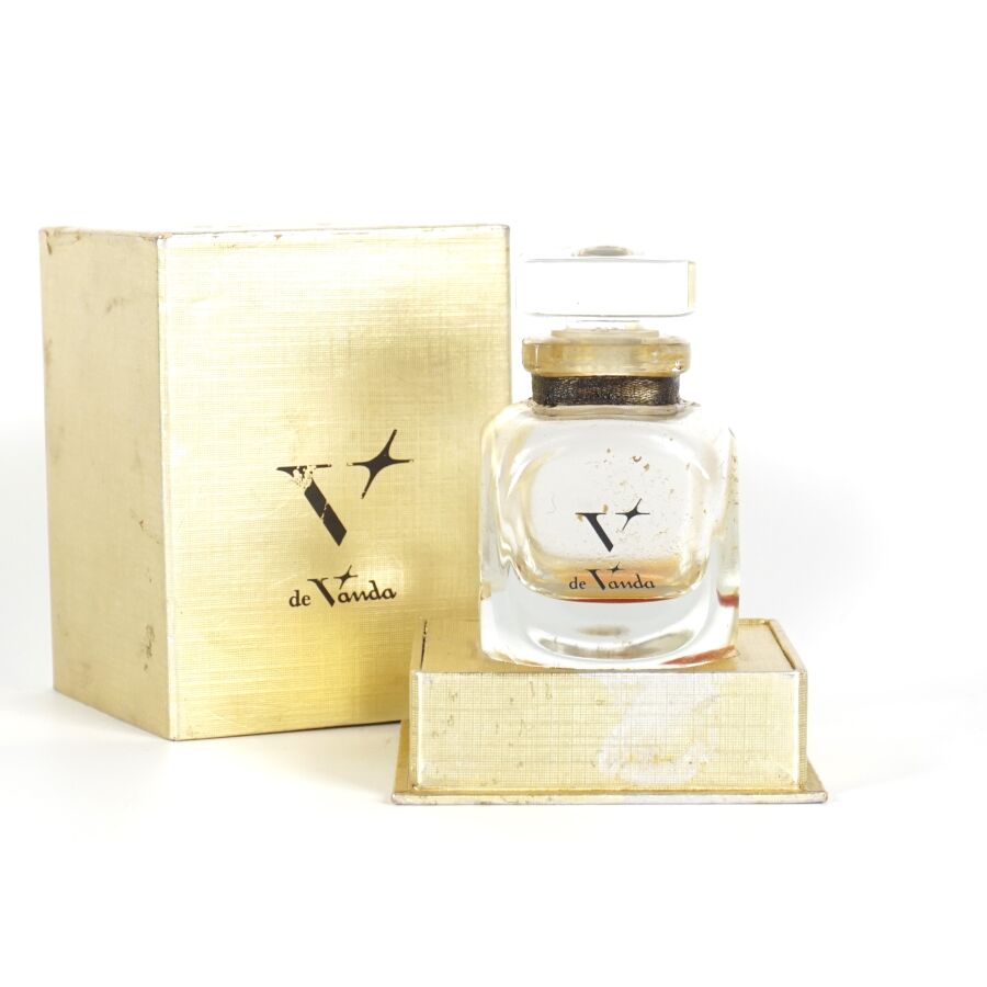 - VANDA : "V de Vanda", flacon arrondi, avec son bouchon, présenté dans son emboîtage d'origine doré, H. Flacon : 7 cm (vide, résidu de PDO).