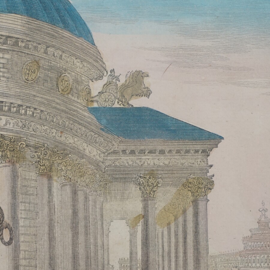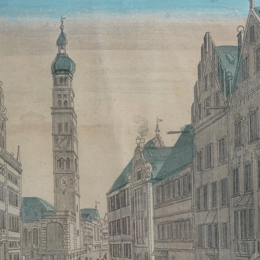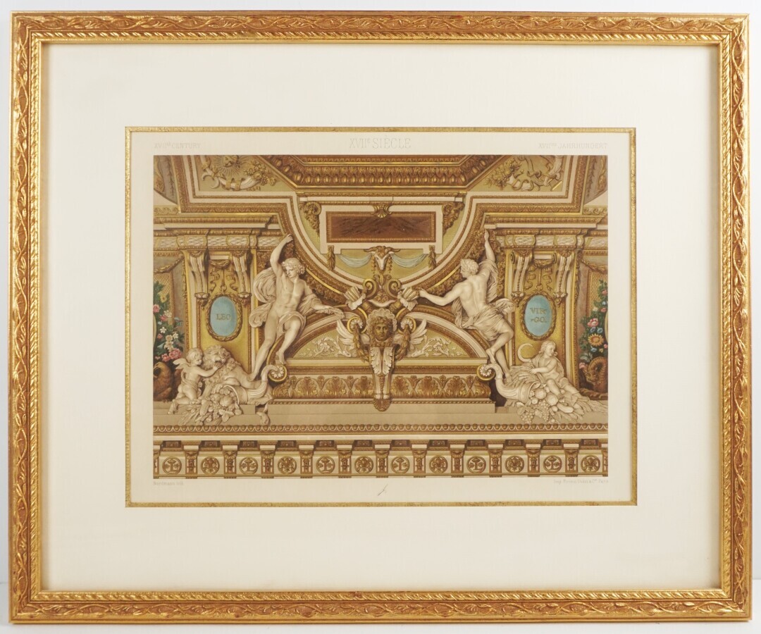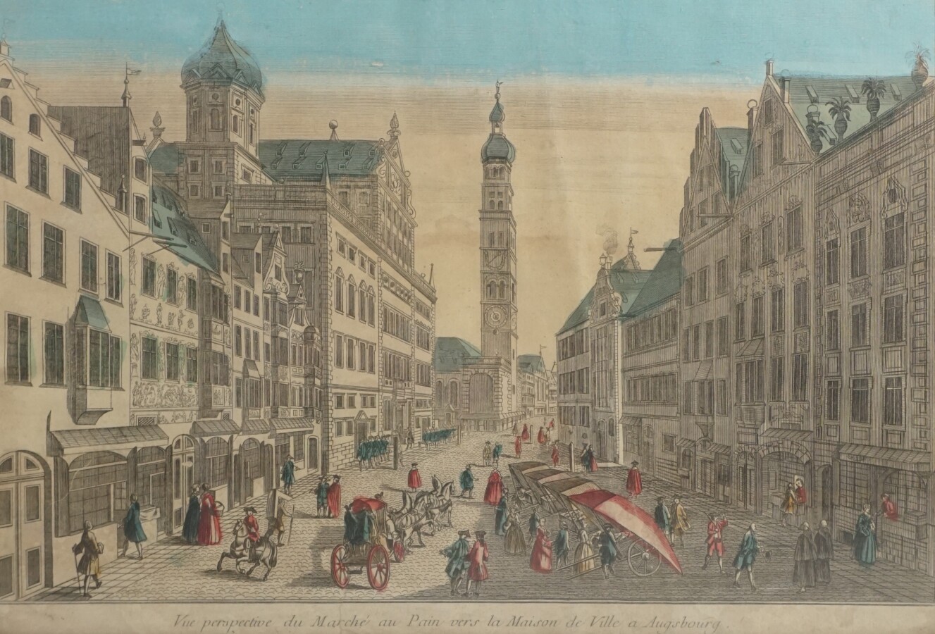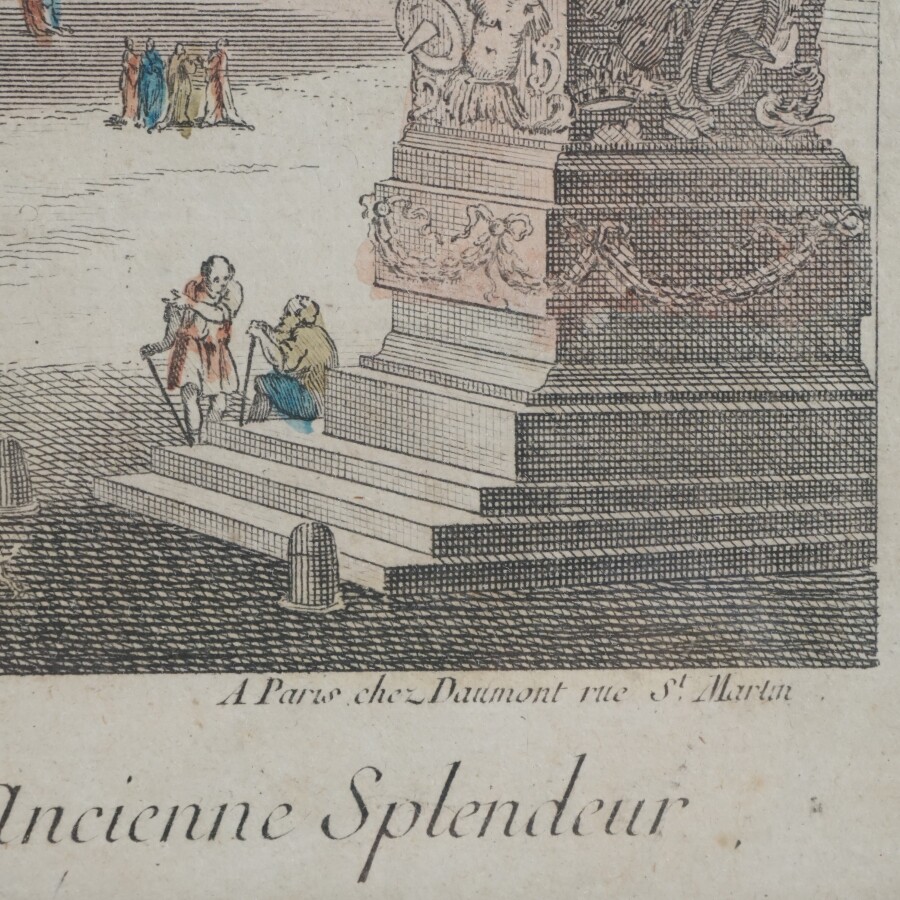 Ensemble de trois gravures comprenant Anonyme (XIXe), "Vue d'optique" et "Perspective du marché au pain", gravures, Daumont à Paris, 28 x 41.5 cm (usures, pliures) et BRANDIN (lithographe), "XVIIe siècle", lithographie imprimée par Firmin Didot & Cie, Paris, 33 x 22.5 cm (à vue).