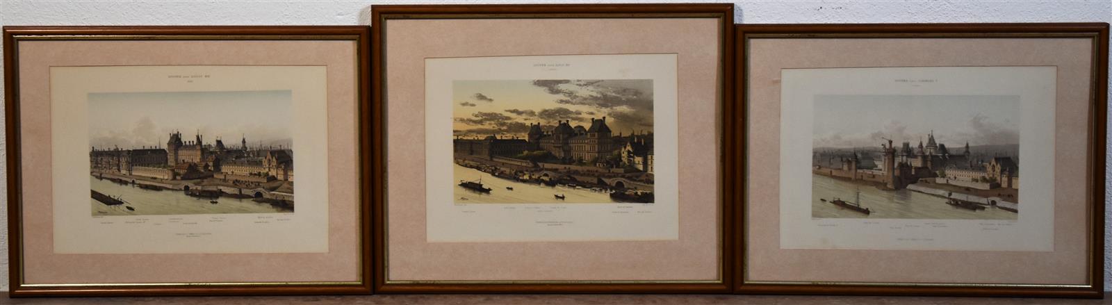 Ensemble de trois lithographies représentant des vues du Louvre sous Charles X, Louis XIII et Louis XIV, de 27.7 x 37.4 cm à 27.7 x 40.2 cm