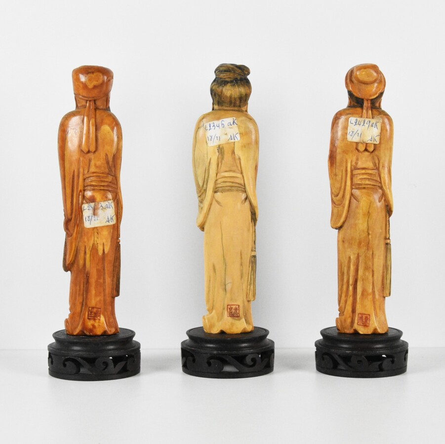 Ensemble de trois personnages en ivoire sculpté, représentant des sages, deux tenants des poissons, et l'un une branche fleurie, Chine, circa 1930, H. 17.5 cm. Poids brut : 770 g environ.