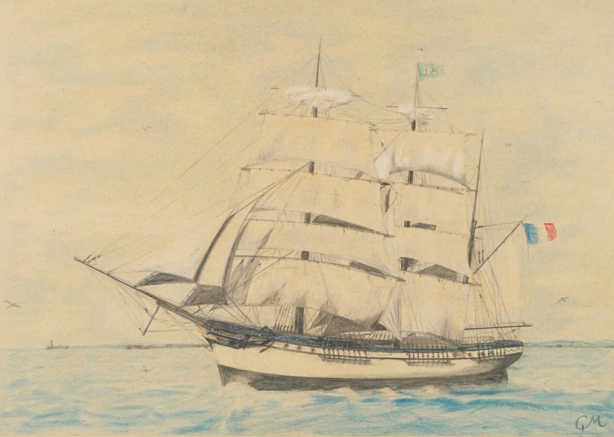 Ensemble de trois pièces encadrées comprenant "Vendée", aquarelle et encre (30.5 x 45.5 cm) ; "Snoris", aquarelle titrée sur papier (26 x 30 cm) et "Trois mâts barque", crayon, monogrammé GM (24 x 34 cm).