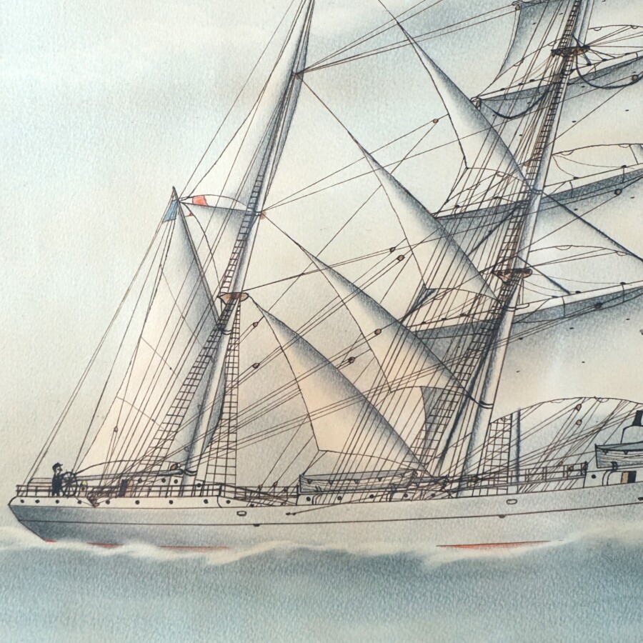 Ensemble de trois pièces encadrées comprenant "Vendée", aquarelle et encre (30.5 x 45.5 cm) ; "Snoris", aquarelle titrée sur papier (26 x 30 cm) et "Trois mâts barque", crayon, monogrammé GM (24 x 34 cm).