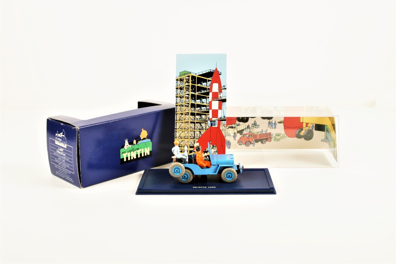 Ensemble de trois voitures miniatures Tintin : la Ford T de "Tintin au Congo", le Bolide rouge des "Cigares du Pharaon" et la Jeep d' "Objectif Lune", édition Atlas, dans leurs boîtes d'origine (usures d'usage sur les boîtes).