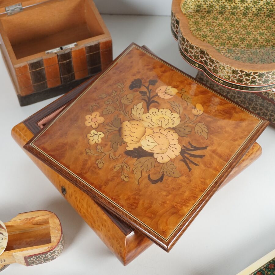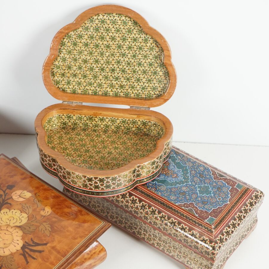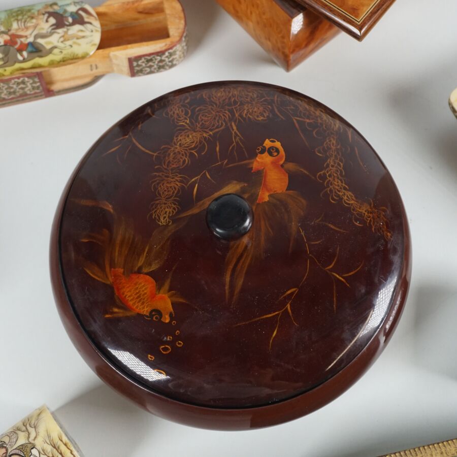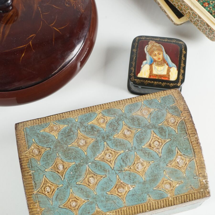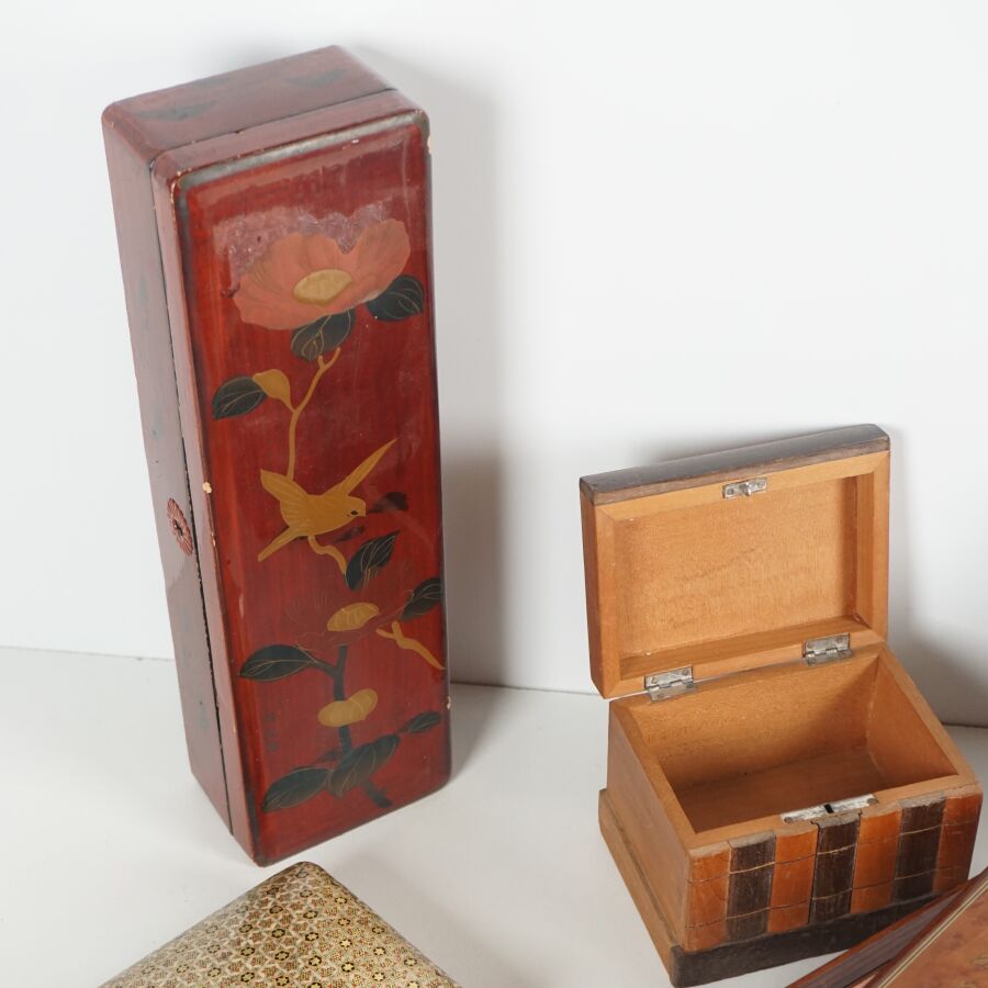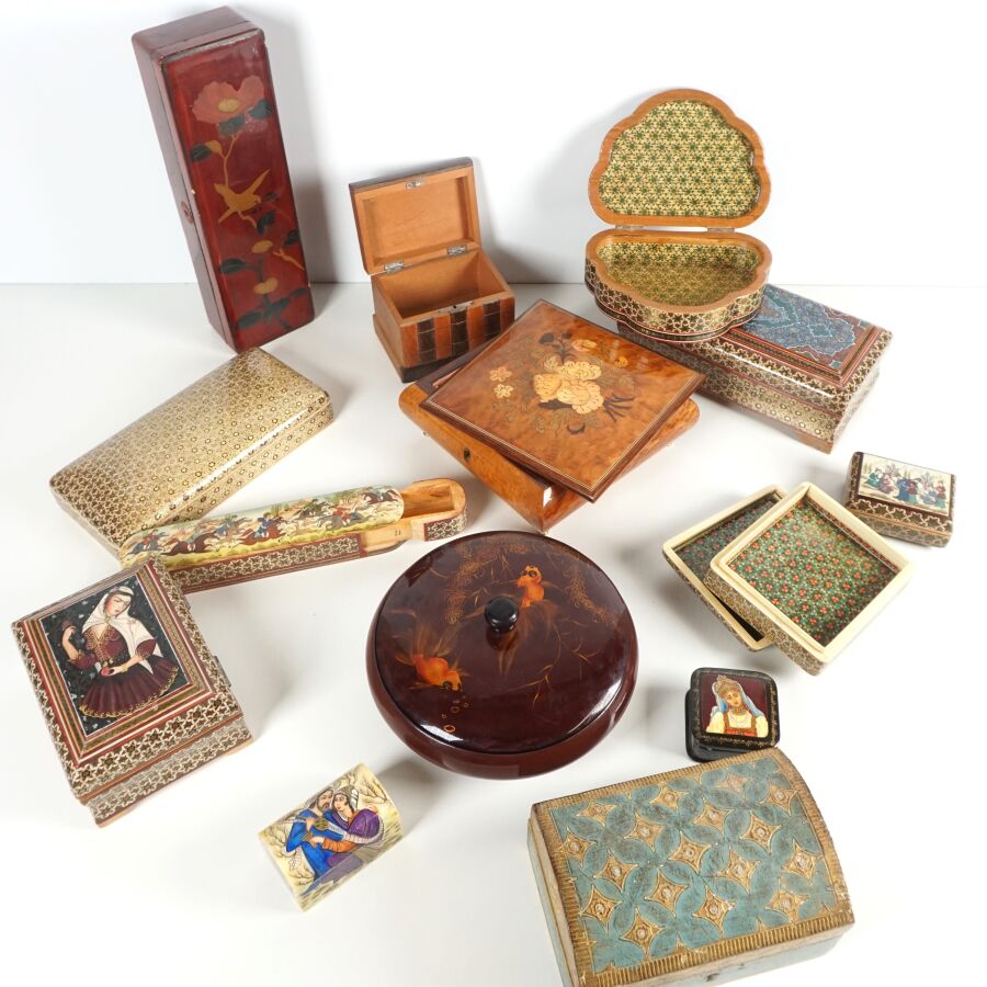 Ensemble d'environ 14 boîtes diverses, bois, laque, résine et matière composite, à décor dans le goût de l'Orient et de l'Extrême-Orient, divers formats (en l'état, usures).