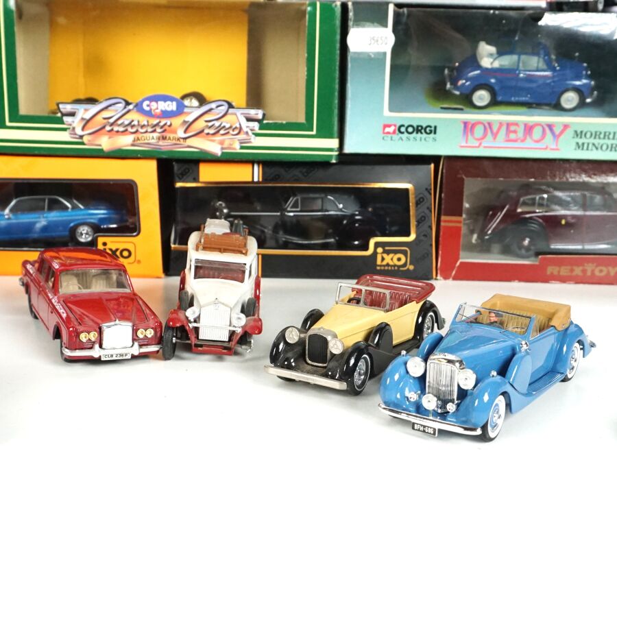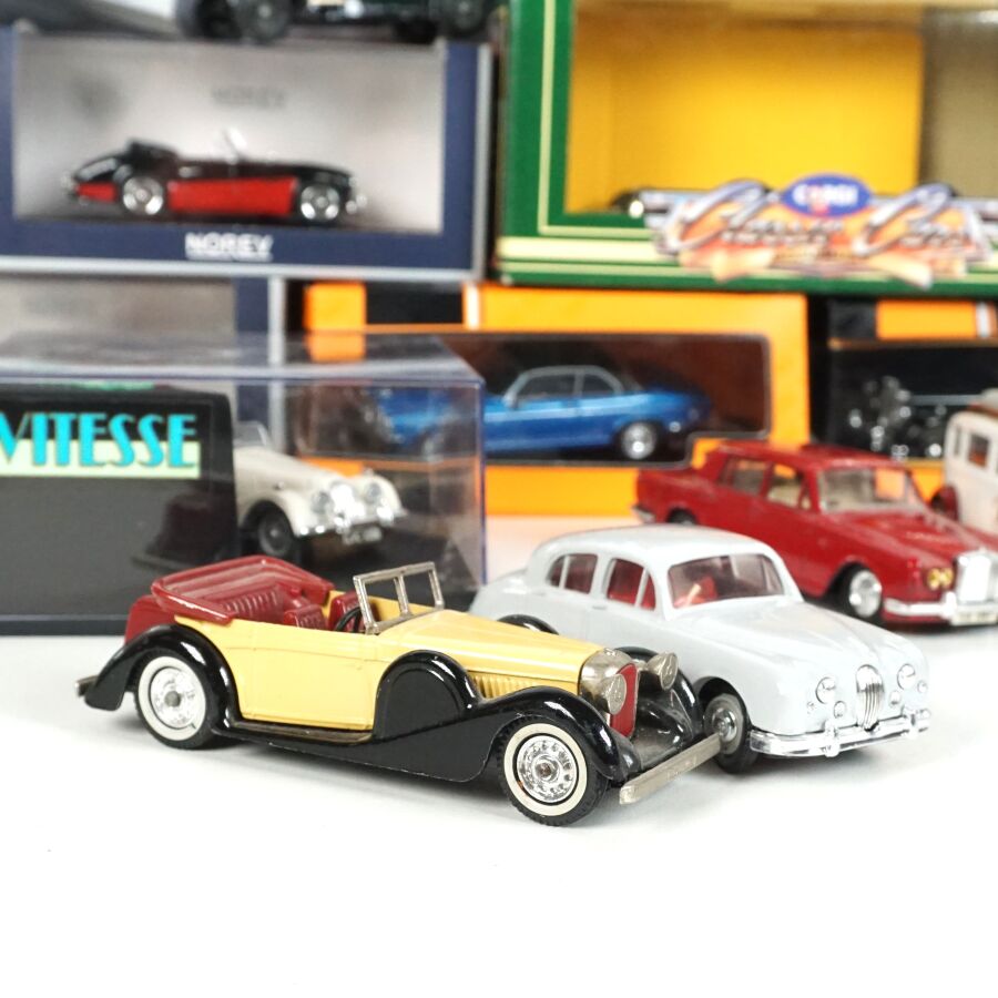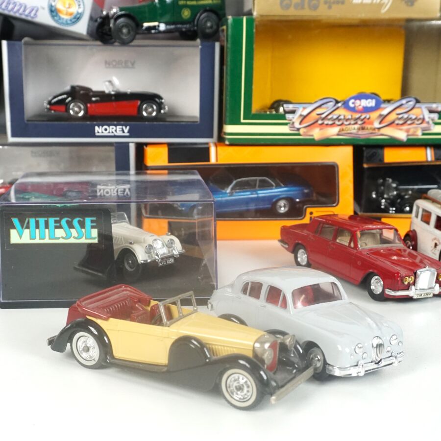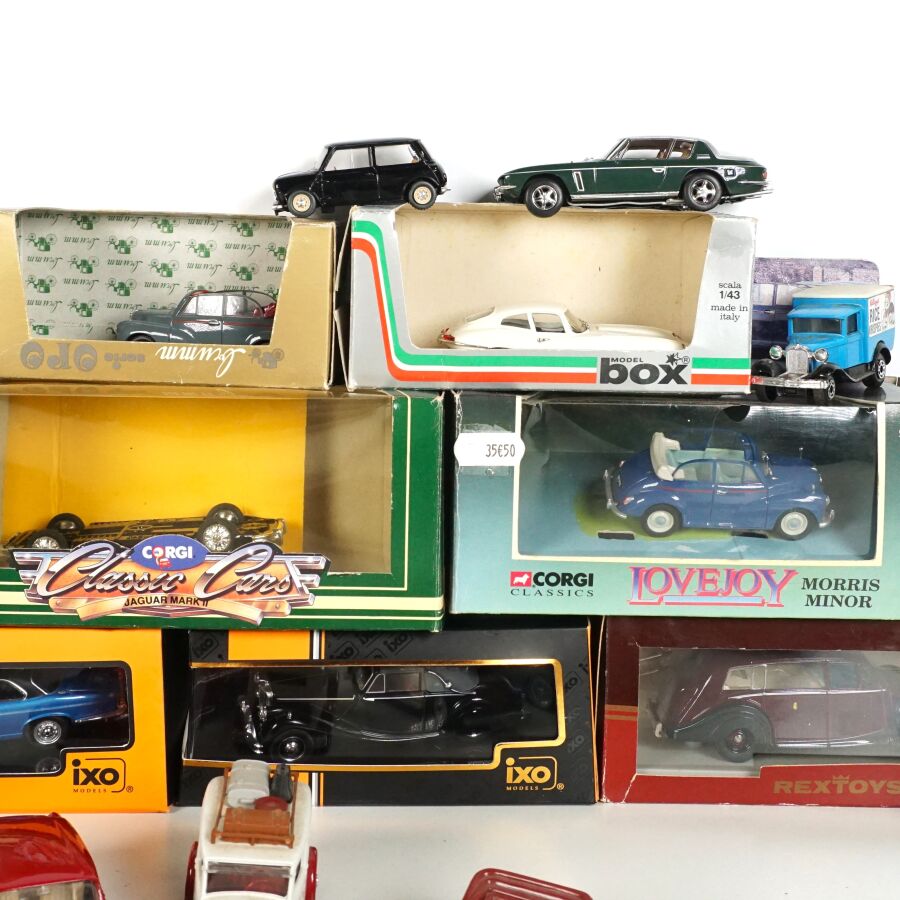 Ensemble d'environ 30 véhicules de marques diverses, échelle 1/43ème, comprenant notamment (1) ELIGOR : Jaguar MK1 grise, (1) IXO : Jaguar MK V 3.5 Litre DHC Cabrio 1950, noire, (1) VEREM : Rolls Royce Sylver Cloud, réf. 310, (1) NOREV : Triumph Spitfire MK4 1972 Pimento Red, (1) REXTOYS, Rolls-Royce Phantom IV Limousine, noire et bordeaux, (1) CORGI Classic Cars : Jaguar Mark II, réf. C700/3, noire, et divers, certains en boîte d'origine (usures, écaillures, manques).