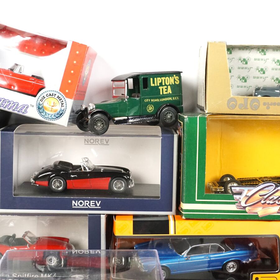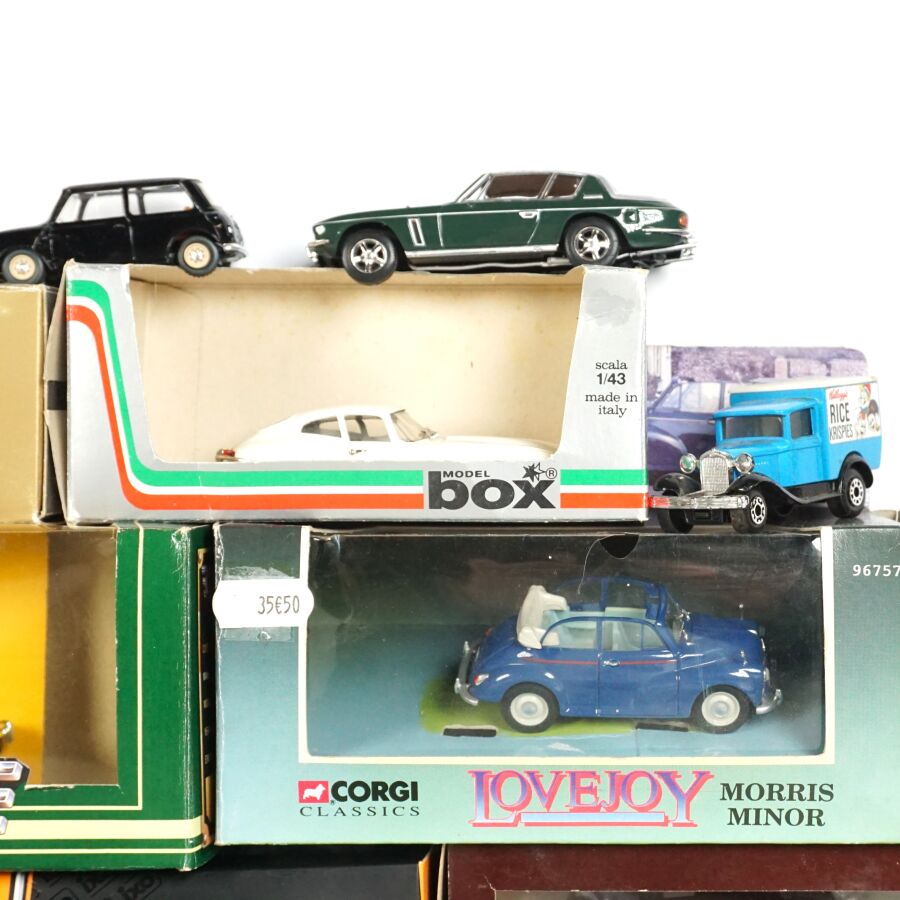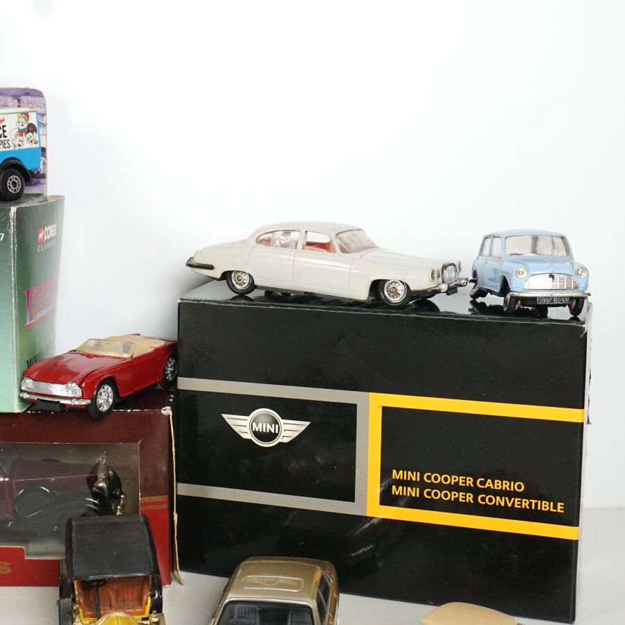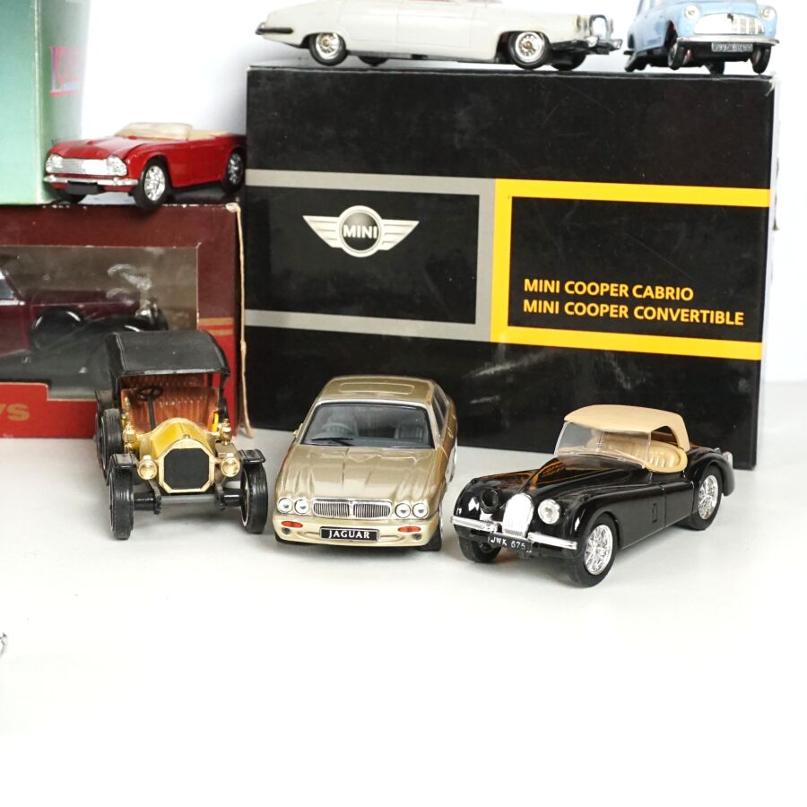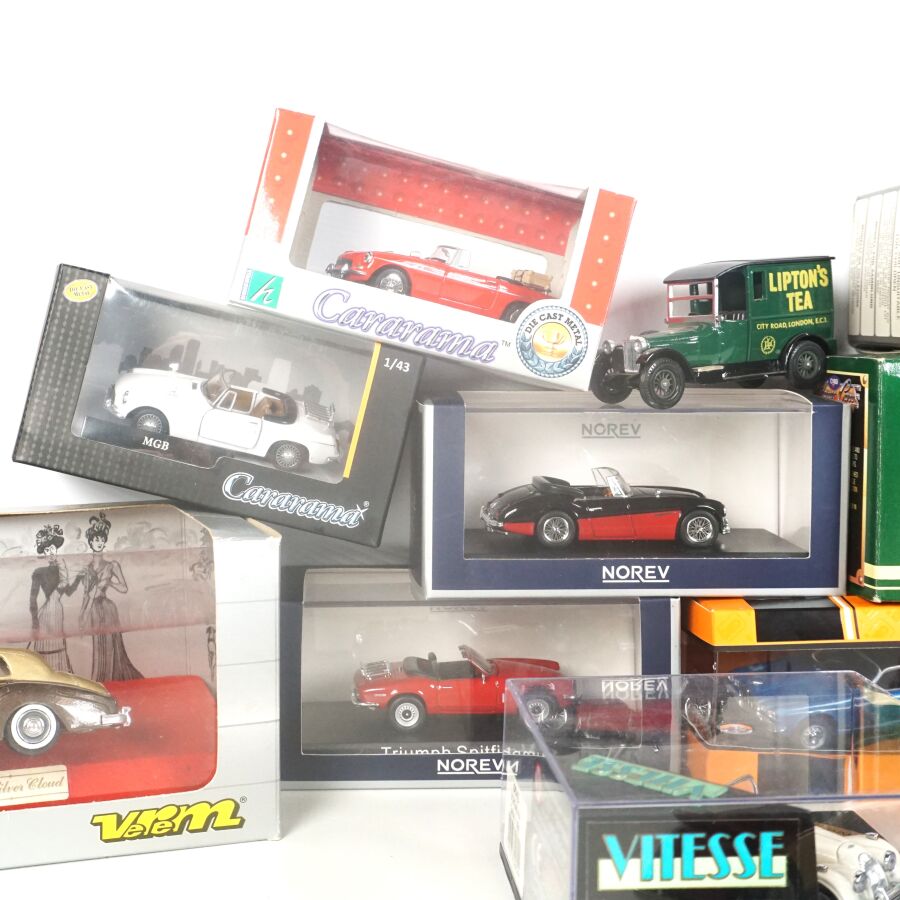 Ensemble d'environ 30 véhicules de marques diverses, échelle 1/43ème, comprenant notamment (1) ELIGOR : Jaguar MK1 grise, (1) IXO : Jaguar MK V 3.5 Litre DHC Cabrio 1950, noire, (1) VEREM : Rolls Royce Sylver Cloud, réf. 310, (1) NOREV : Triumph Spitfire MK4 1972 Pimento Red, (1) REXTOYS, Rolls-Royce Phantom IV Limousine, noire et bordeaux, (1) CORGI Classic Cars : Jaguar Mark II, réf. C700/3, noire, et divers, certains en boîte d'origine (usures, écaillures, manques).