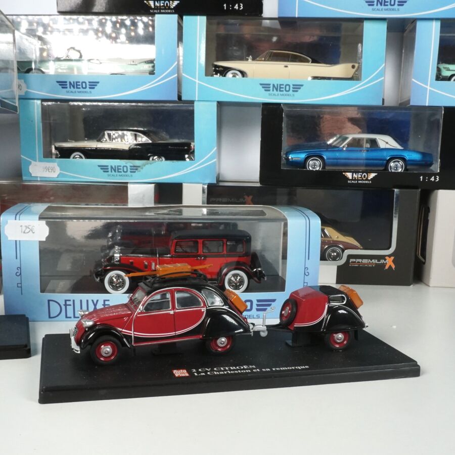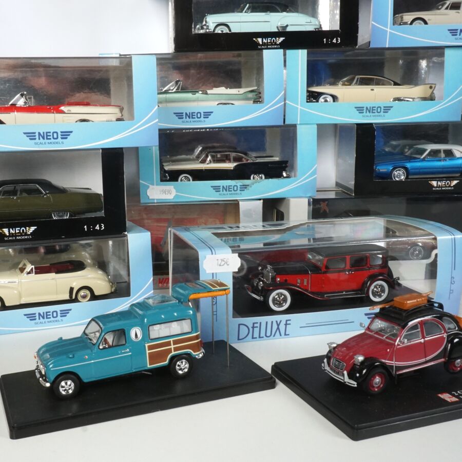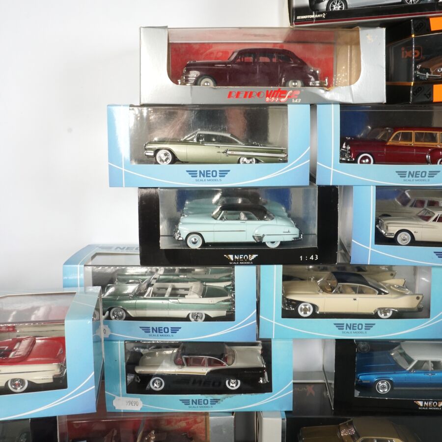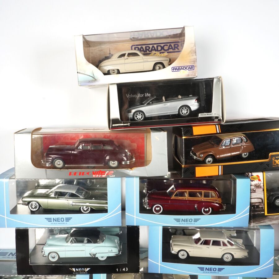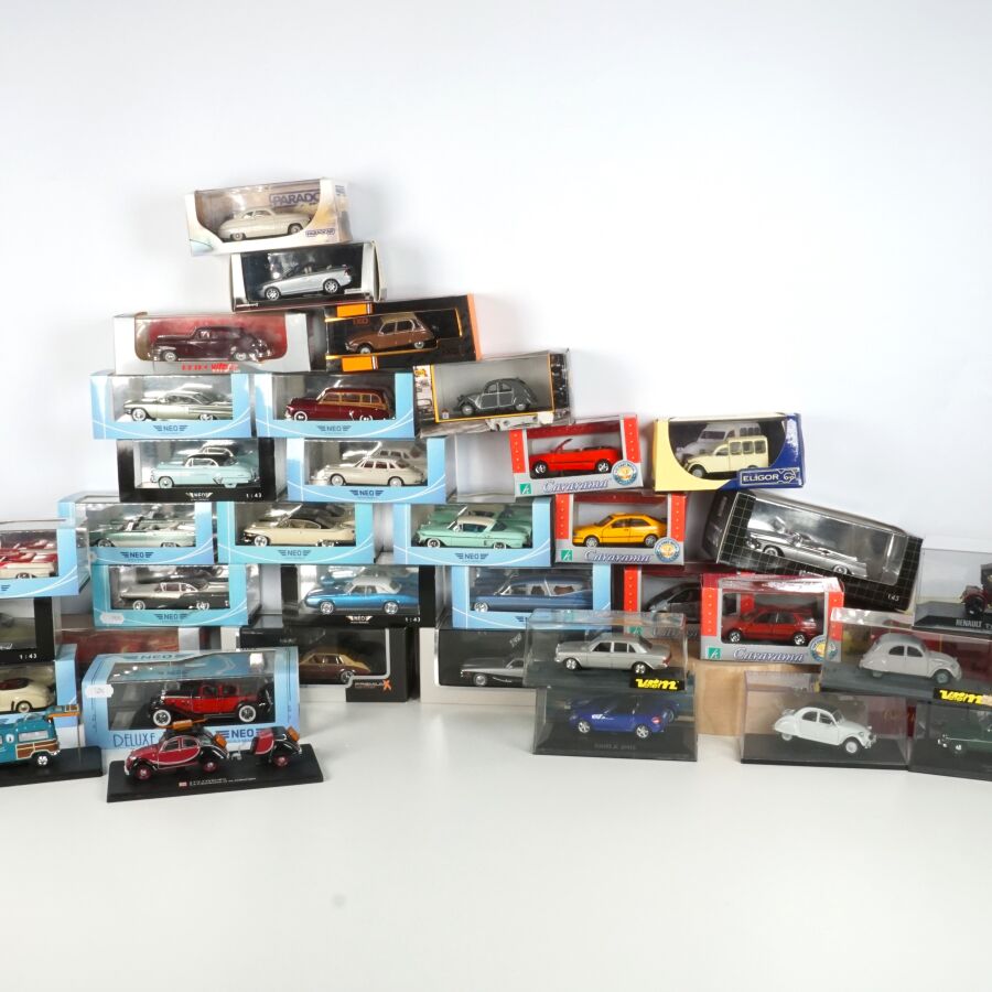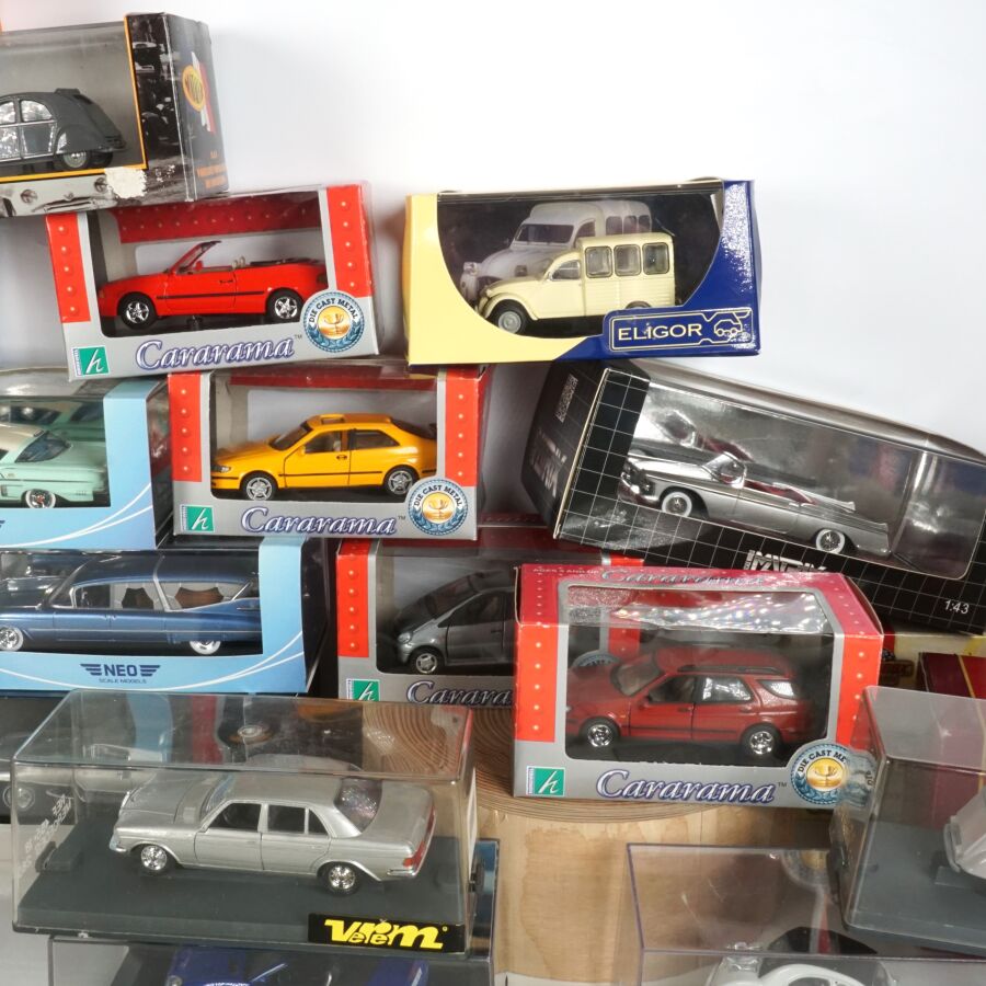Ensemble d'environ 40 véhicules divers, échelle 1/43ème, comprenant notamment (1) CARARAMA : Saab 9.3 Viggen, réf. 350/2520, jaune ; (1) Mercedes-Benz 350 SLK Roadster 2005, bleue ; (1) RETRO VITESSE : Cadillac Eldorado 1950-53 Open cabriolet, réf. 280, noire ; (1) PARADCAR PLUS : Ford Vedette coupe 1949, réf. P171, crème ; (1) PREMIUM X : Cadillac Séville "Élégante" 1980, réf. PRD110, dorée et marron ; (1) Citroën 2CV Charleston 1982, bordeaux et noire ; et divers, la plupart présentés en boite d'origine (légères usures).