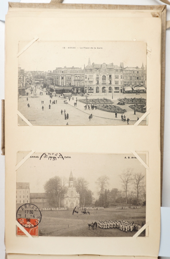 Ensemble d'environ 500 cartes postales anciennes et 30 photographies dont 7 albums In-12° et In-8° titrés : " 23 jours dans l'est. 1911 " (43 CPA : Verdun, Belleville, Nancy, Givet, Dinant, ), " Deux ans de promenades " (88 CPA : Chantilly, Gisors, Rouen, Le Havre, Saint-Adresse, Boulogne-sur-Mer, Calais, Dunkerque, Malo-les-Bains, Lille, Arras, ), " Un tour en Belgique. 1909 (39 CPA : Anvers, Bruxelles, Gand, Bruges, Ostende, ), " Un tour en Suisse. 1906 " (17 photos et 25 CPA dont 4 panoramiques : Berne, Lucerne, Meiringen, Aarcschlucht, Trümmelbach, Petite Scheidegg, La Yungfrau, Alphornbläser, Grindelwald, ), " Un coin des Vosges et d'Alsace. 1911 " (24 CPA dont 1 panoramique : Gérardmer, Münster, La Schlucht et le Hohneck, ), " Les bords de la Loire. Berry-Bourbonnais. 1907 " (53 CPA et 12 photos : Orléans, Olivet, Blois, Chambord, Onzain, Chaumont-sur-Loire, Amboise, Tours, Vouvray, Chenonceaux, Bourges, Moulins, ), " La Basse-Loire. 1912 " : (29 CPA : Angers, Nantes, Saint-Nazaire, La Baule) et 1 enveloppe contenant 49 CPA du sud de la France (Nîmes, Arles, Marseille, Toulon, Beaulieu, Saint-Jean, Villefranche, Vence, Cannes, Antibes, Menton, ), 1 enveloppe contenant 18 CPA de Monaco, 1 enveloppe contenant 30 CPA de Nice, 1 enveloppe contenant 13 CA de Fontainebleau, 1 enveloppe contenant 38 CPA du Dauphiné et de la Suisse, 1 enveloppe contenant 6 CPA de la collection Monument de la bataille de Champigny, 1 enveloppe contenant 87 CPA de Paris (dont 15 de la collection Bouillons Maggi), et 1 enveloppe contenant 60 CPA de villes diverses (Maintenon, Chartres, Angers, Beauvais, Nancy, Auxerre, ) - Très bel état général.