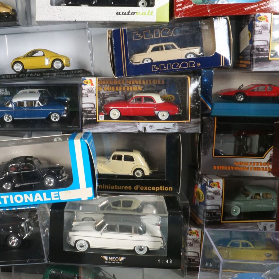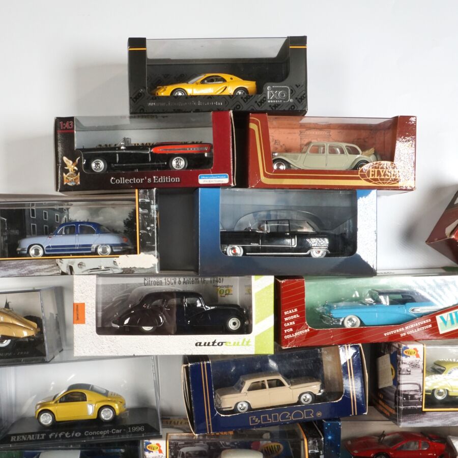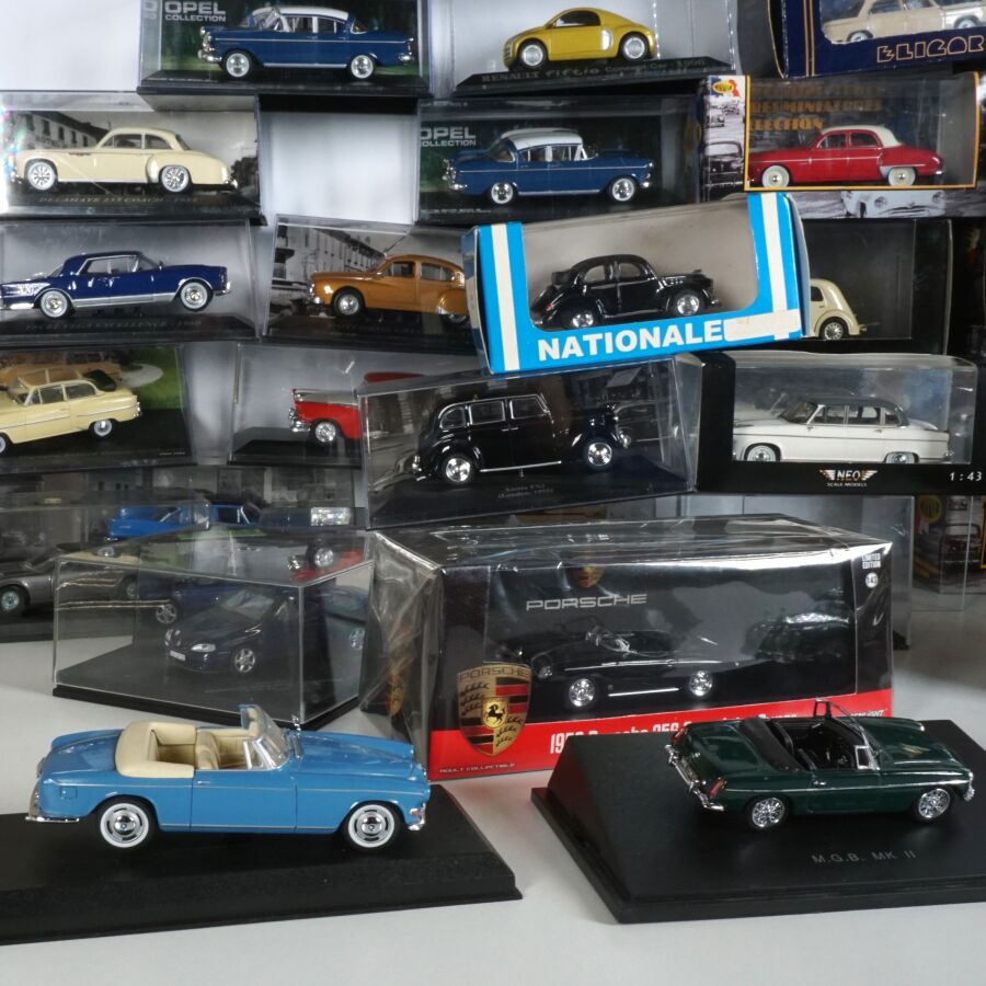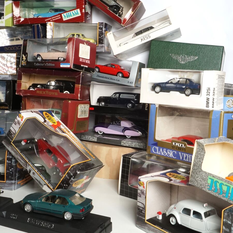 Ensemble d'environ 65 véhicules, échelle 1/43ème, comprenant notamment (1) MINICHAMPS : Cadillac Série 62 Cabriolet, 1948, mauve et violette ; (1) Bentley Mulsanne, réf. NEO 44170, marron/bordeaux ; (1) VITESSE : Nash Metropolitain Open Convertible, 1959, réf. 032, orange et blanche ; (1) Austin Healey Sprite, 1959, blanche ; (1) Ford Thunderbird, 1966, rose pâle ; (1) Porsche 356 Speedster Super, 1958, noire ; et divers, la plupart présenté en boîte d'origine (usures).