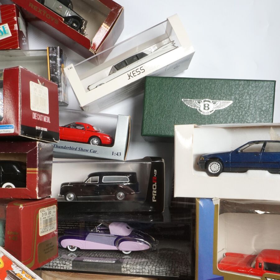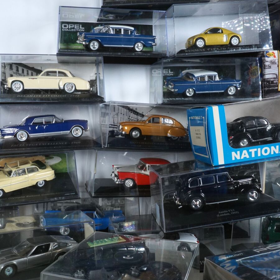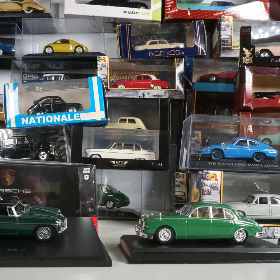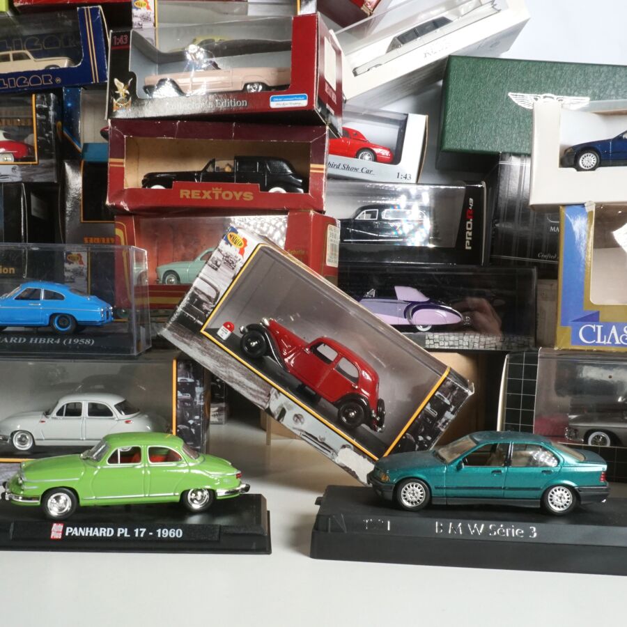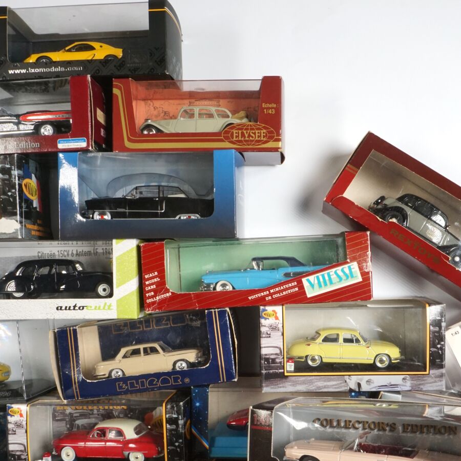 Ensemble d'environ 65 véhicules, échelle 1/43ème, comprenant notamment (1) MINICHAMPS : Cadillac Série 62 Cabriolet, 1948, mauve et violette ; (1) Bentley Mulsanne, réf. NEO 44170, marron/bordeaux ; (1) VITESSE : Nash Metropolitain Open Convertible, 1959, réf. 032, orange et blanche ; (1) Austin Healey Sprite, 1959, blanche ; (1) Ford Thunderbird, 1966, rose pâle ; (1) Porsche 356 Speedster Super, 1958, noire ; et divers, la plupart présenté en boîte d'origine (usures).