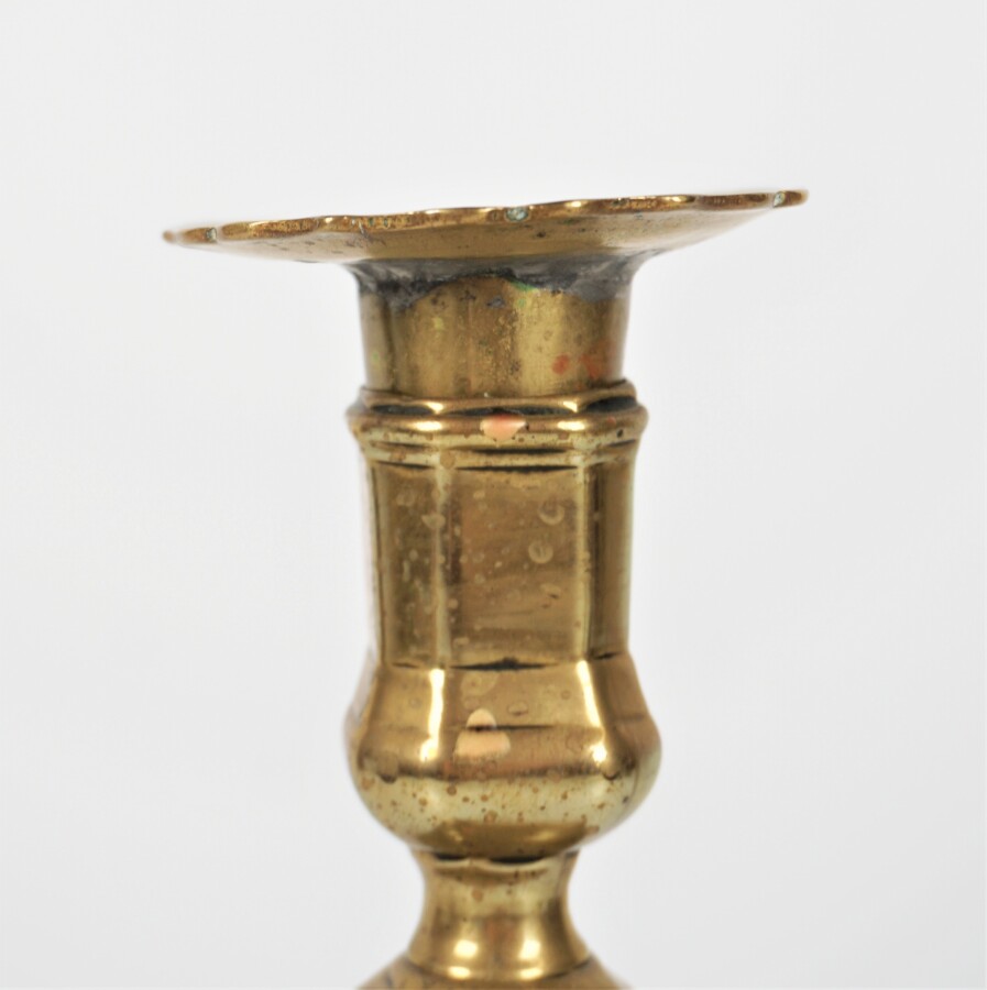 Ensemble dépareillé de 8 bougeoirs comprenant deux bougeoirs en métal argenté et six en laiton, l'un électrifié monté en lampe, un second à remonter (en l'état, bobèches rapportées).