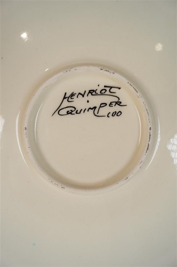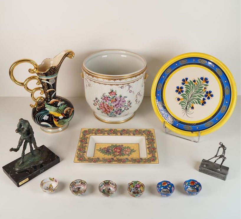 Ensemble divers comprenant un seau en porcelaine dans le goût chinois, une verseuse H. BEQUET Quaregnon, un plat HENRIOT, un cendrier ROSENTHAL, des petits bols miniatures dans le goût de l'Asie (accidentés et un cassé et recollé), 2 sculptures et divers.