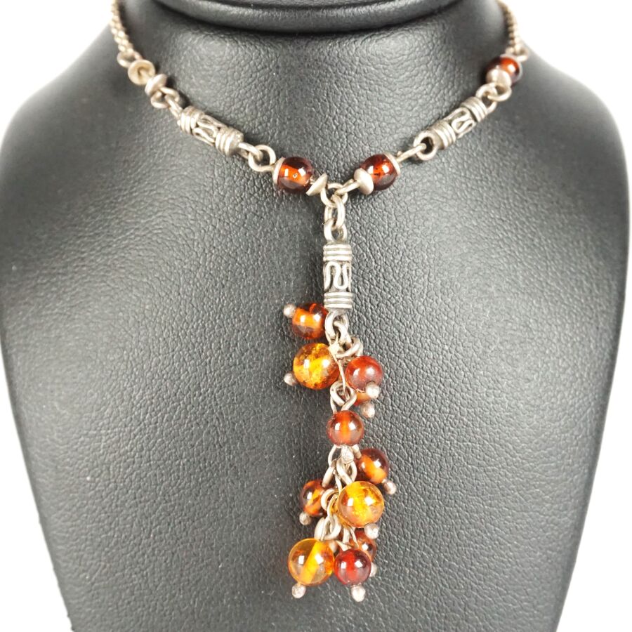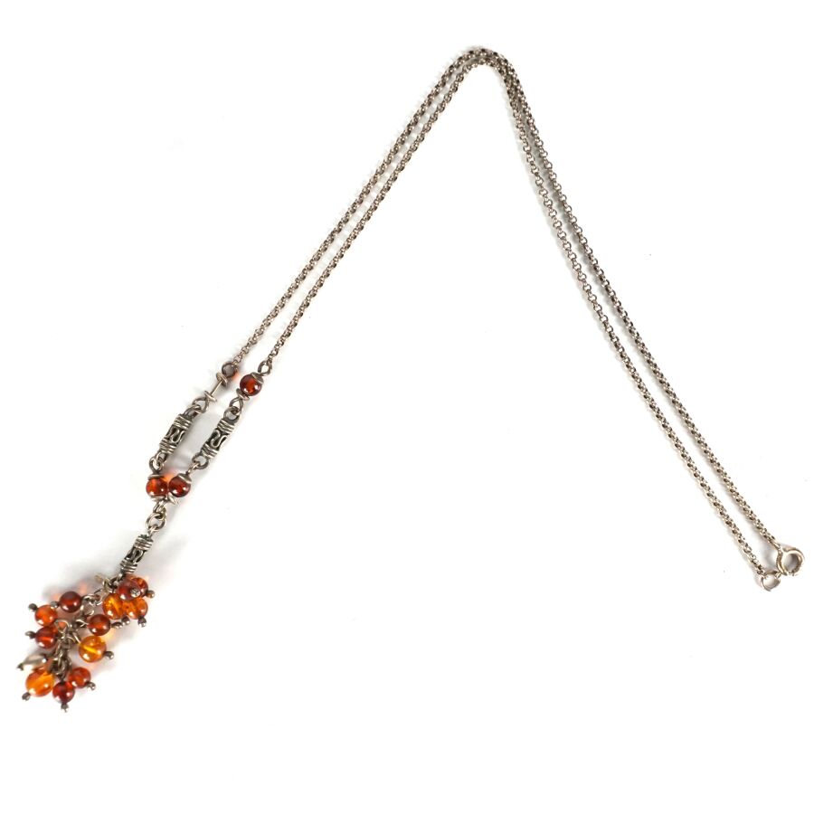 - Collier, maille forçat, retenant une grappe de boules d'ambre, fermoir à anneau ressort, L. 44 cm. L. Pendentif : 4.3 cm.