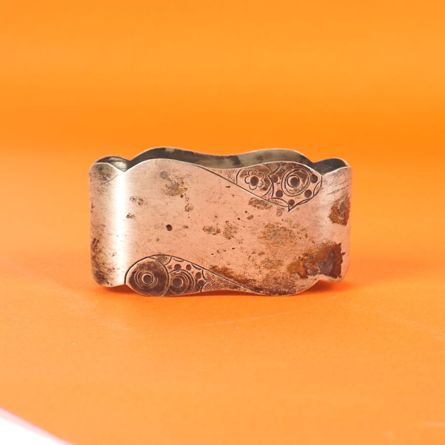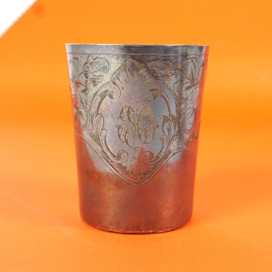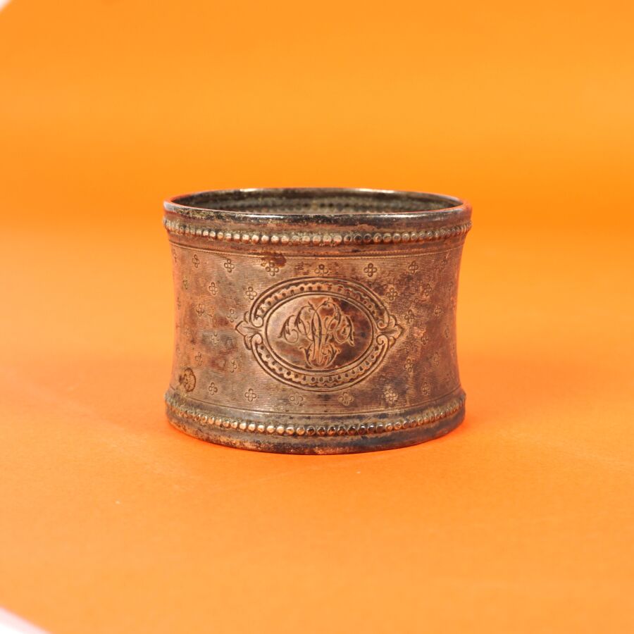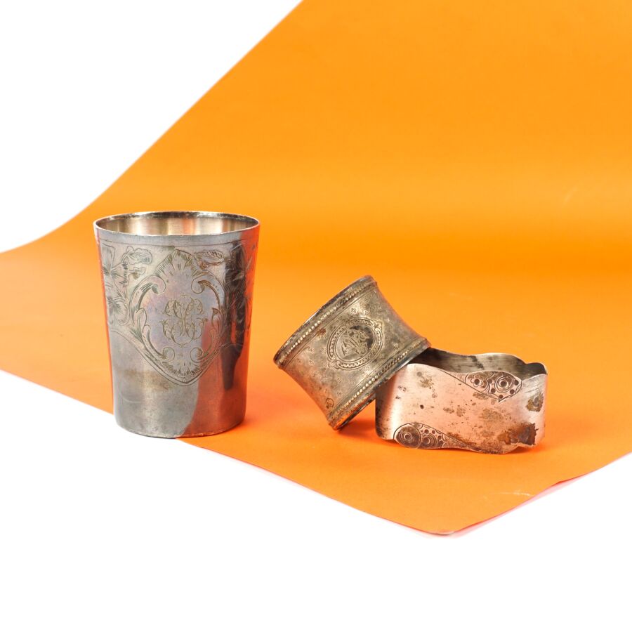 Ensemble en argent, poinçon Minerve 1er titre, comprenant une timbale à décor d'un médaillon et d'une frise fleurie, et deux ronds de serviette, l'un de forme ronde orné d'un médaillon, le second de forme ovale, H. Timbale : 8 cm. Poids brut : 160 g environ (chocs).