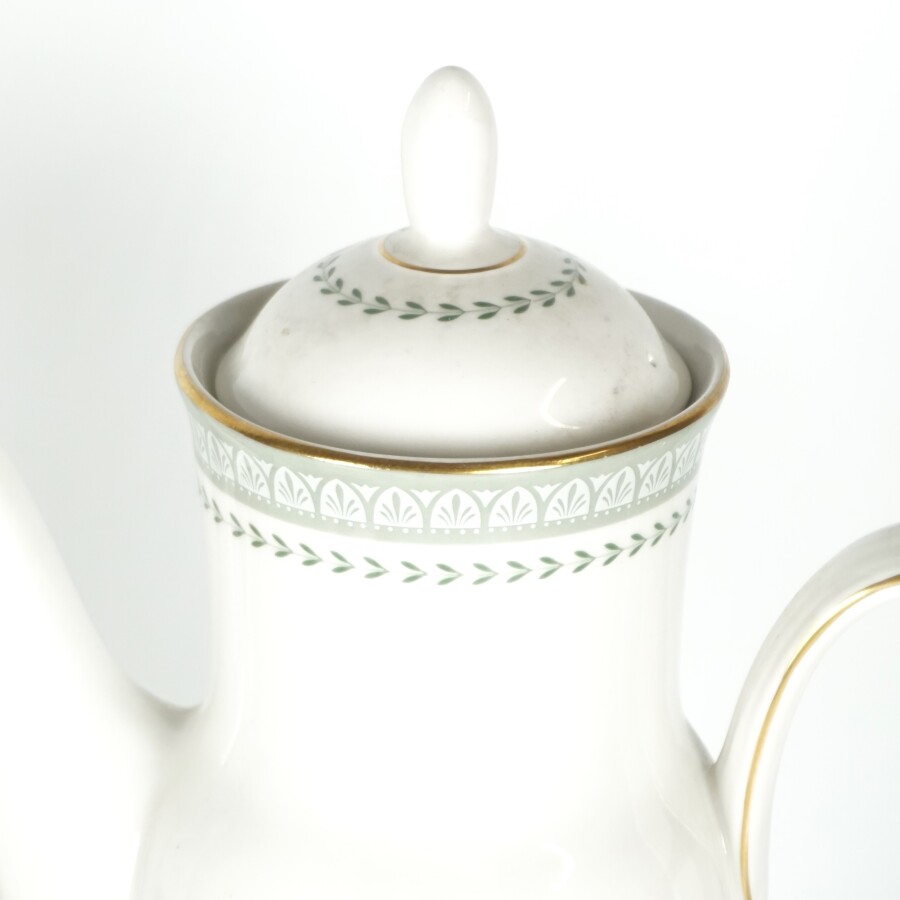 Ensemble en céramique comprenant une partie de service à thé-café en porcelaine émaillée à décor d'une frise de palmettes vertes Berkshire, Angleterre comprenant 1 verseuse, 1 pot à lait, 1 bol, 6 tasses et leurs sous-tasses (traces).
