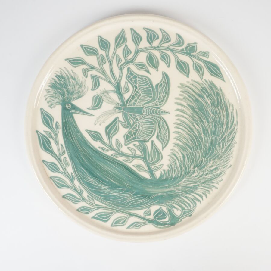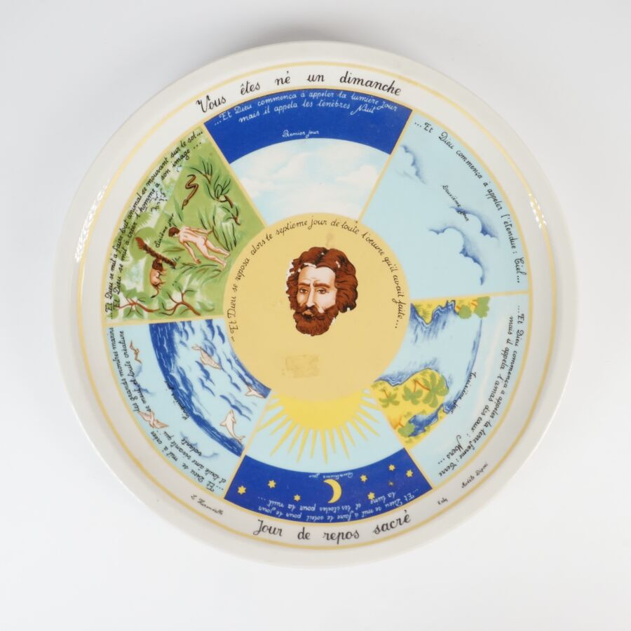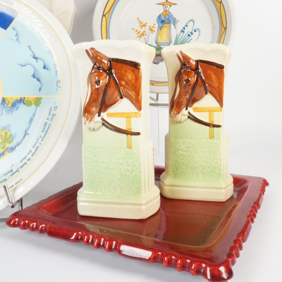 Ensemble en céramique dépareillé, comprenant 9 assiettes, 2 dessous de plat et paire de vases formant garniture de cheminée (en l'état, usures et fêles).