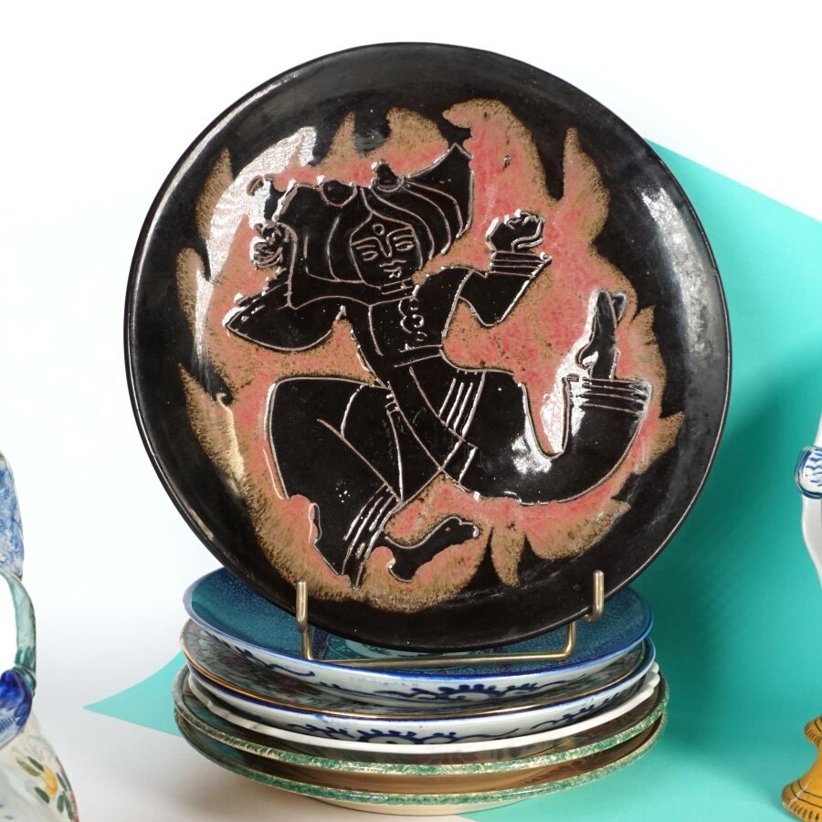 Ensemble en céramique, dépareillé, comprenant jardinière de table en faïence à décor de blasons et rinceaux, anses en col de cygne, Quimper (L. 43 cm) ; Coupe polylobée en faïence émaillée polychrome figurant un couple de breton, Quimper (L. 31.5 cm) ; Vase en faïence émaillée polychrome à motif d'un biniou, Quimper (H. 20 cm) ; Encrier en faïence de section carrée (éclats) ; Porte huilier-vinaigrier en faïence (fêle) ; 12 assiettes en porcelaine et faïence dans le goût des Islettes à décor de fleurs, dans le goût de la Chine et Compagnie des Indes et à décor de bretons, Quimper (en l'état, fêles, éclats) : deux salerons en faïence ; une saucière en porcelaine ; 13 tasses à liqueur en faïence et une verseuse et sous-tasse en porcelaine (en l'état).