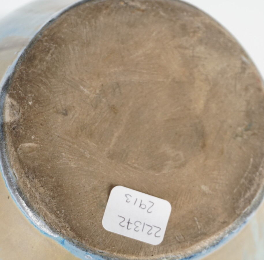 Ensemble en grès émaillés comprenant deux vases et une coupe à décor de coulures ocre sur fond bleu, H. 20 cm, 11 cm et Diam : 19.5 cm.