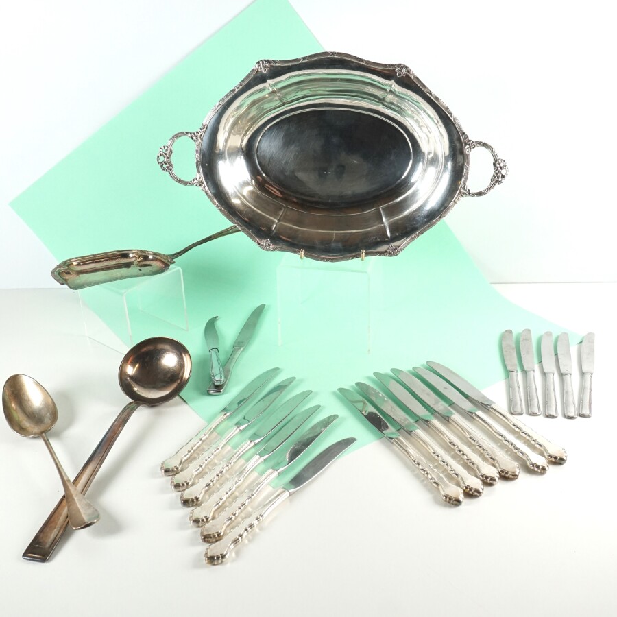 Ensemble en métal argenté comprenant 1 plat creux ovale, bord polylobé à décor végétal, 1 cuillère à ragoût, 1 louche, 1 pelle de table, 12 couteaux, 1 couteau à fromage, et 5 couteaux dépareillés (usures).
