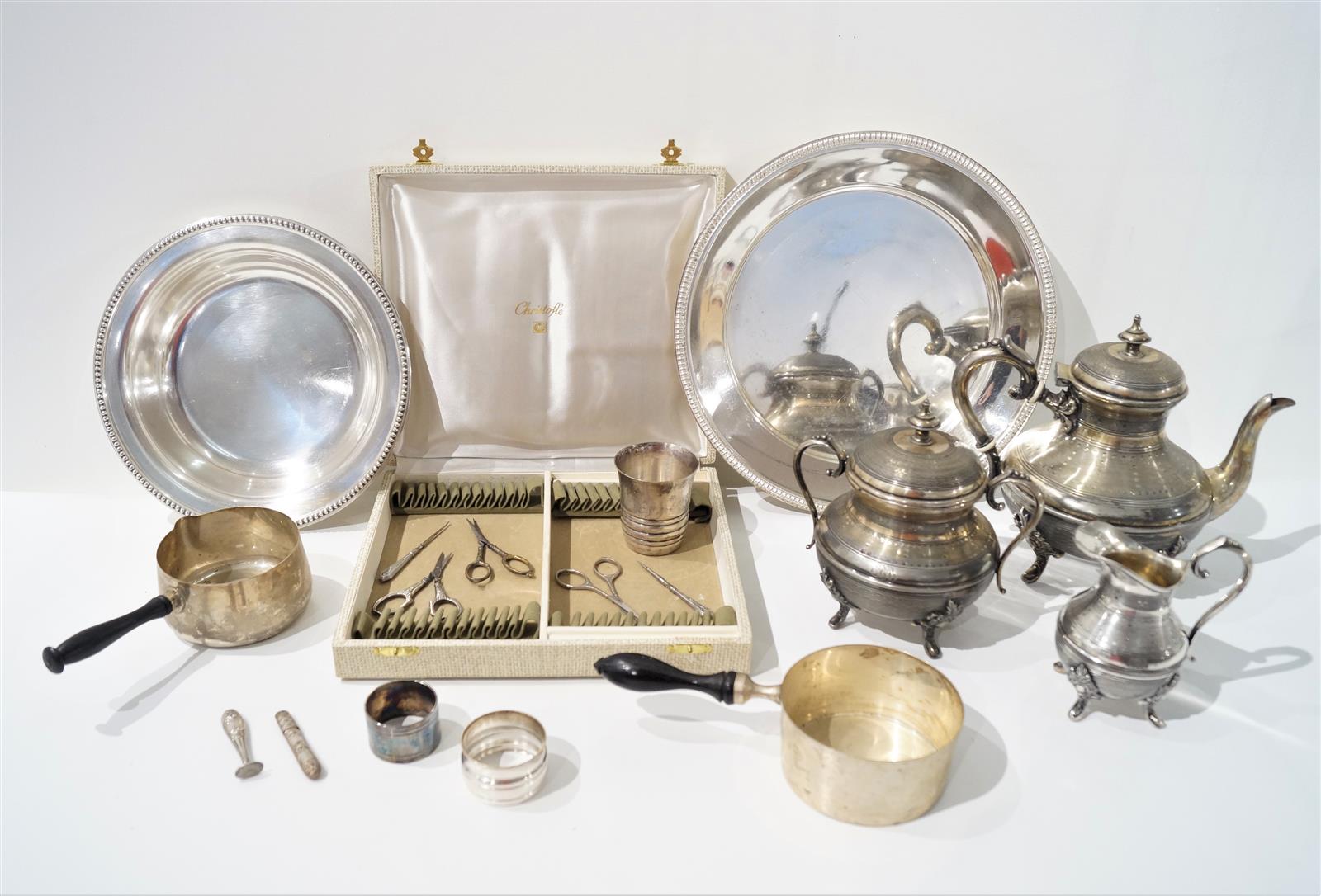 Ensemble en métal argenté comprenant : 2 corbeilles, 2 casserolles, un service 3 pièces (théière, pot à sucre, pot à lait), une timbale, 2 ronds de serviette dont un Christofle, un nécessaire de couture dépareillé et un coffret de couverts Christofle vide.