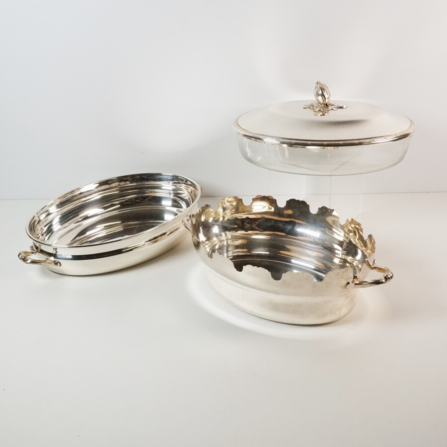 Ensemble en métal argenté comprenant un rafraichissoir, un plat creux et un couvercle en métal argenté, L. 30 cm, 33.5 cm et 37 cm.