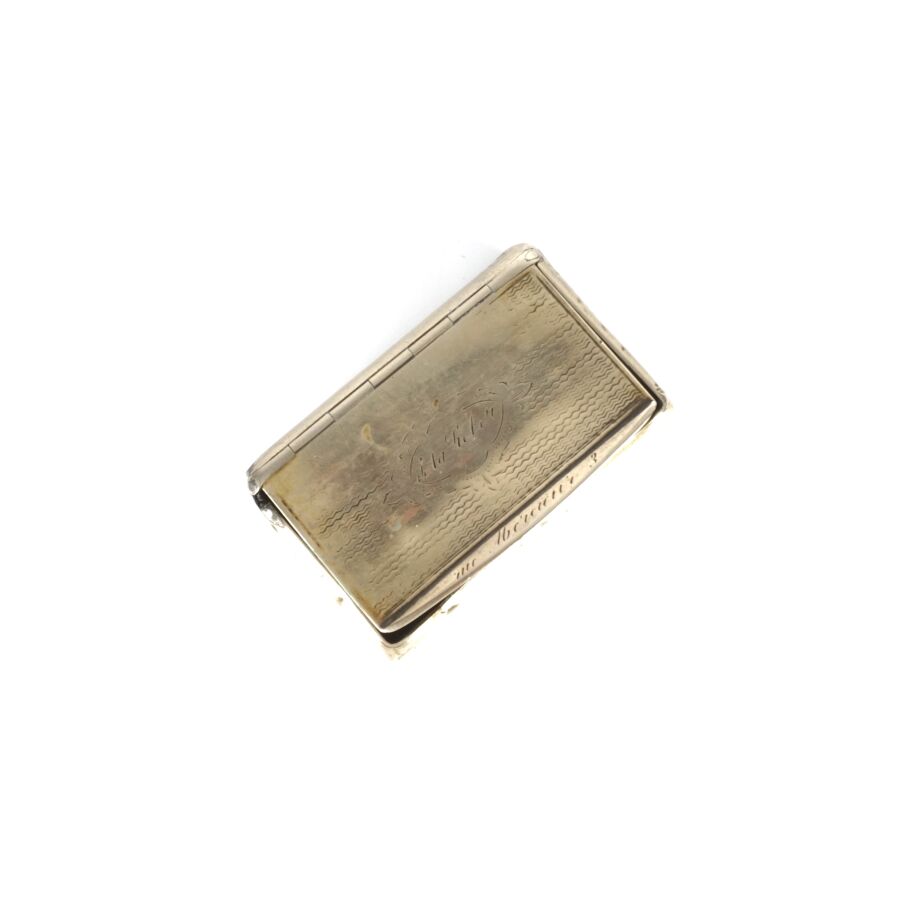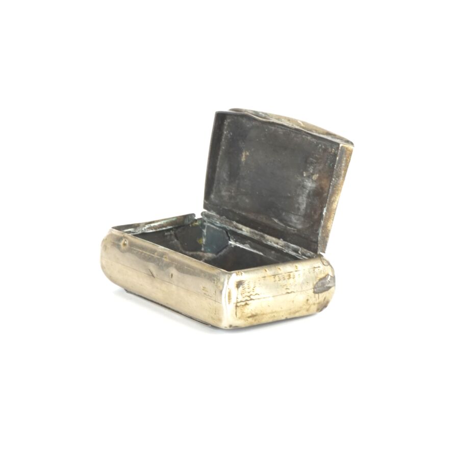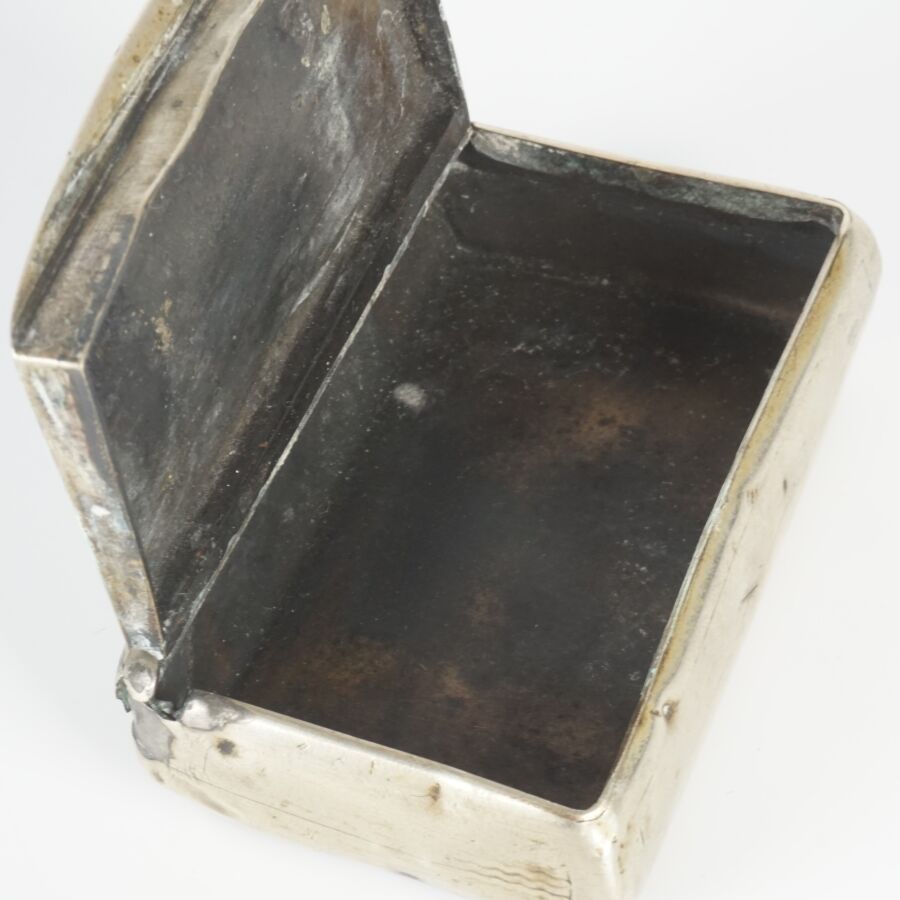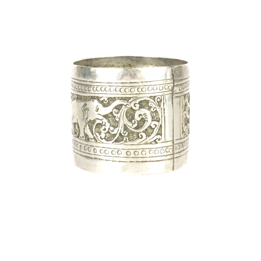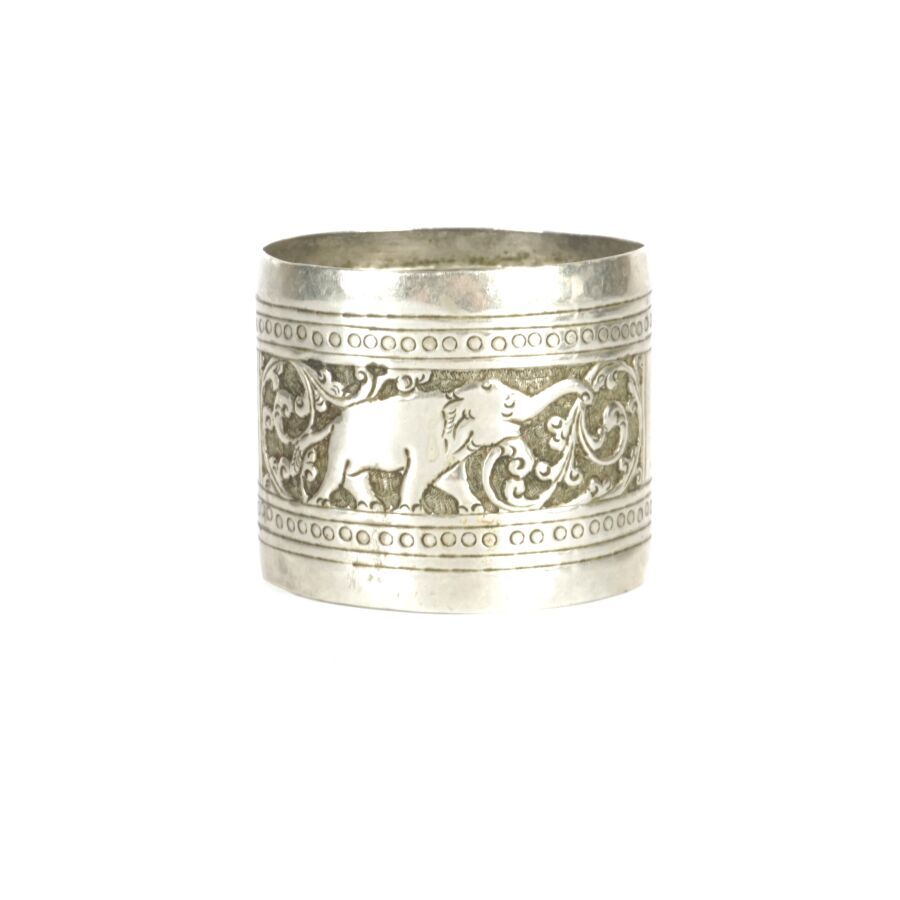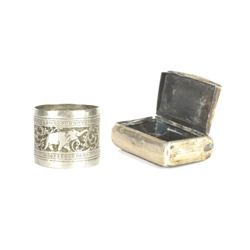 Ensemble en métal argenté comprenant une petite boîte en métal (Poids brut : 50.7 g environ) et un rond de serviette en métal, à décor repoussé d'un éléphant, Asie du sud (Larg. 3.9 cm. Poids brut : 22 g environ).