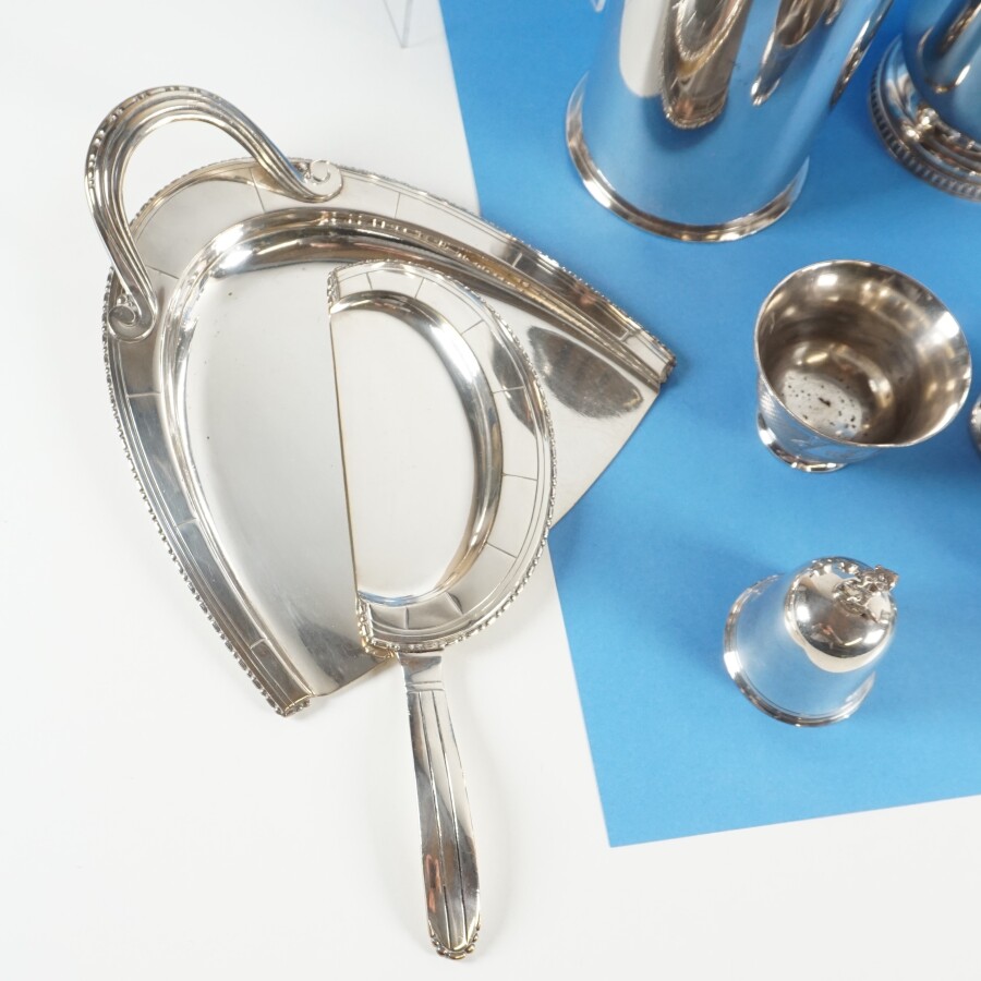 Ensemble en métal argenté dépareillé comprenant timbales, tasses, verseuse, pot couvert, pelles de table, cloche, etc.