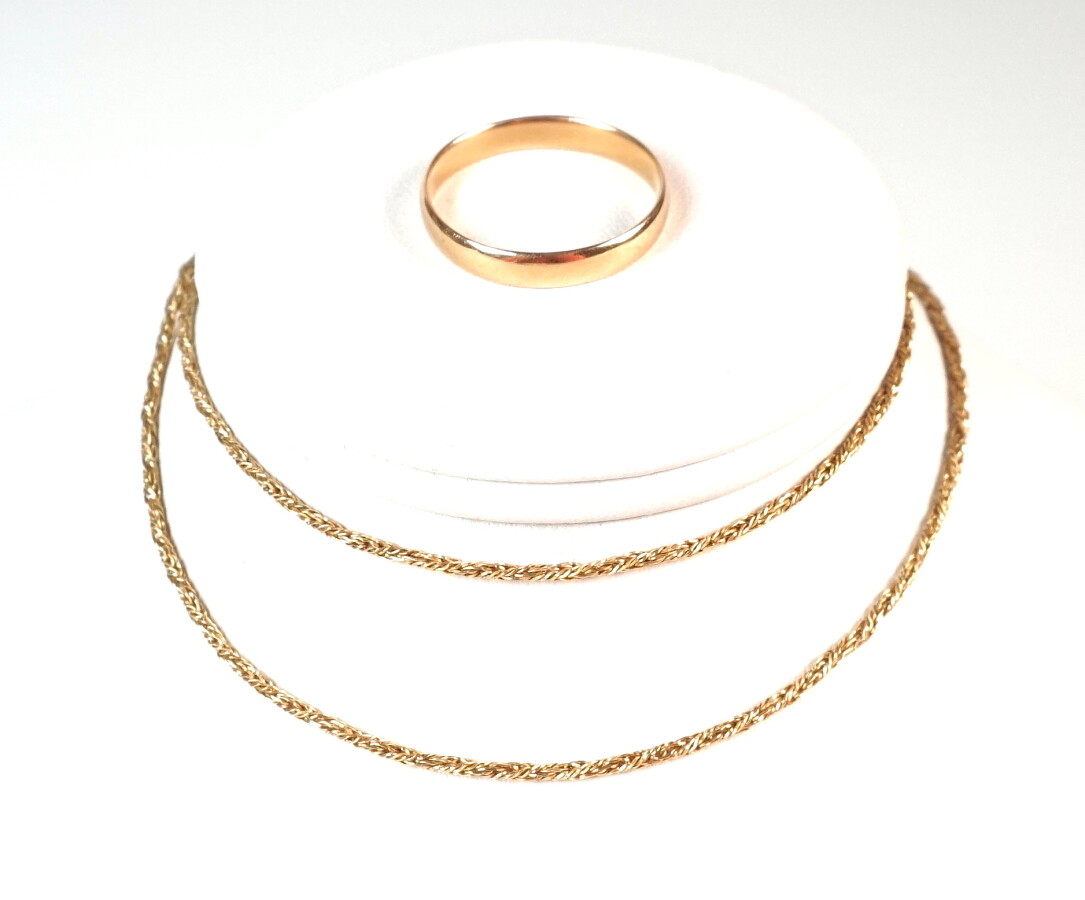 Ensemble en or jaune 18 (750/oo) comprenant : une chaîne maille palmier torsadée, L. 50 cm (fermoir à refixer) et une alliance. TDD 61. Poids brut : 5.4 g environ.