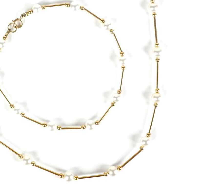 Ensemble en or jaune 18K (750/oo), comprenant un collier et un bracelet, maille bâtonnet ponctuée de perles 4 mm, entourées chacune de petites boules d'or, fermoir mousqueton, L. 44 et 20.5 cm. Poids brut : 9.6 g environ. (AC).