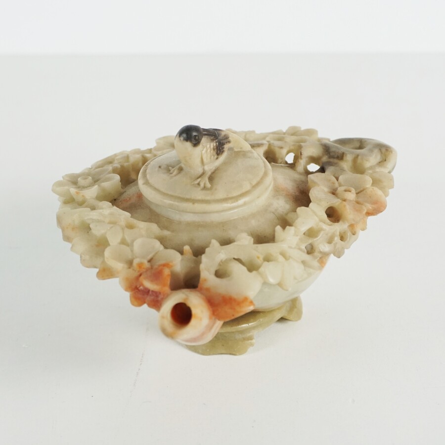 Ensemble en pierre dure, stéatite et pierre noire comprenant deux vases, deux brûles parfum et un buffle d'eau, Chine, 20ème siècle (quelques légères égrenures).