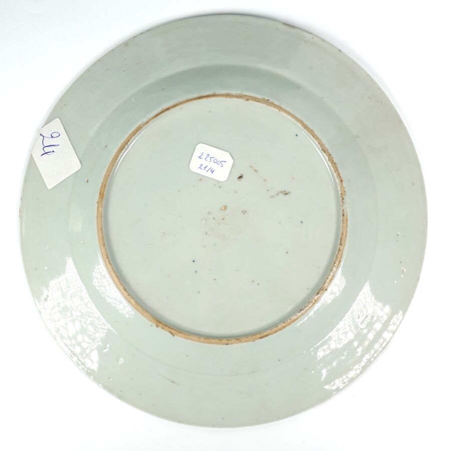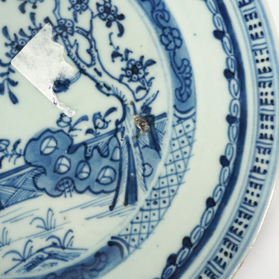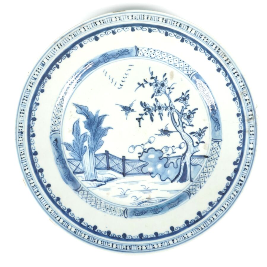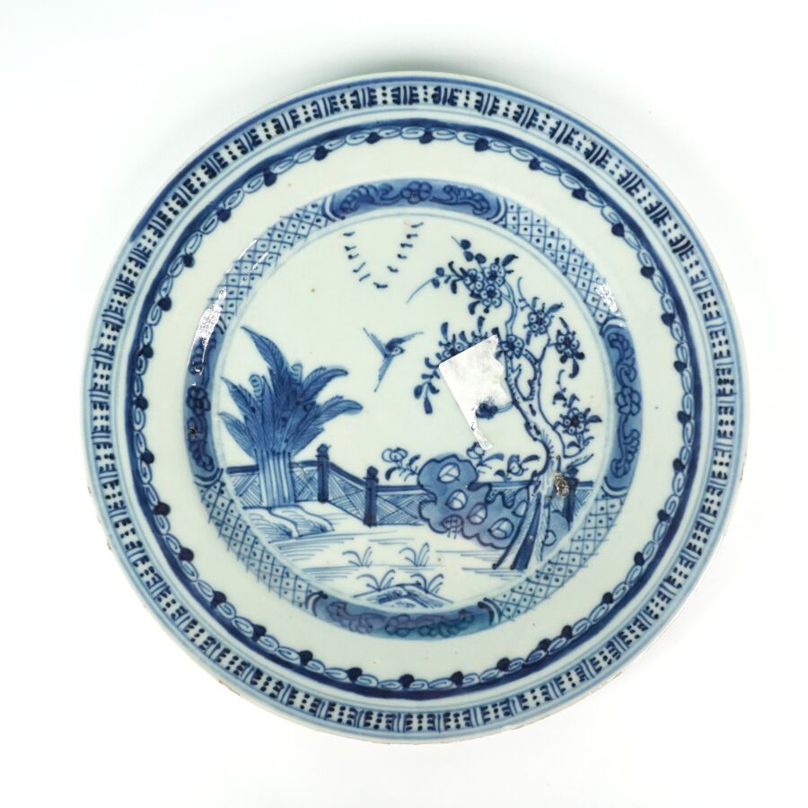 - Paire d'assiettes en porcelaine à décor en bleu et blanc d'une terrasse arborée d'un prunus en fleurs et d'un bananier, Chine, Compagnie des Indes, 18ème siècle, D. 23 cm (égrenures).