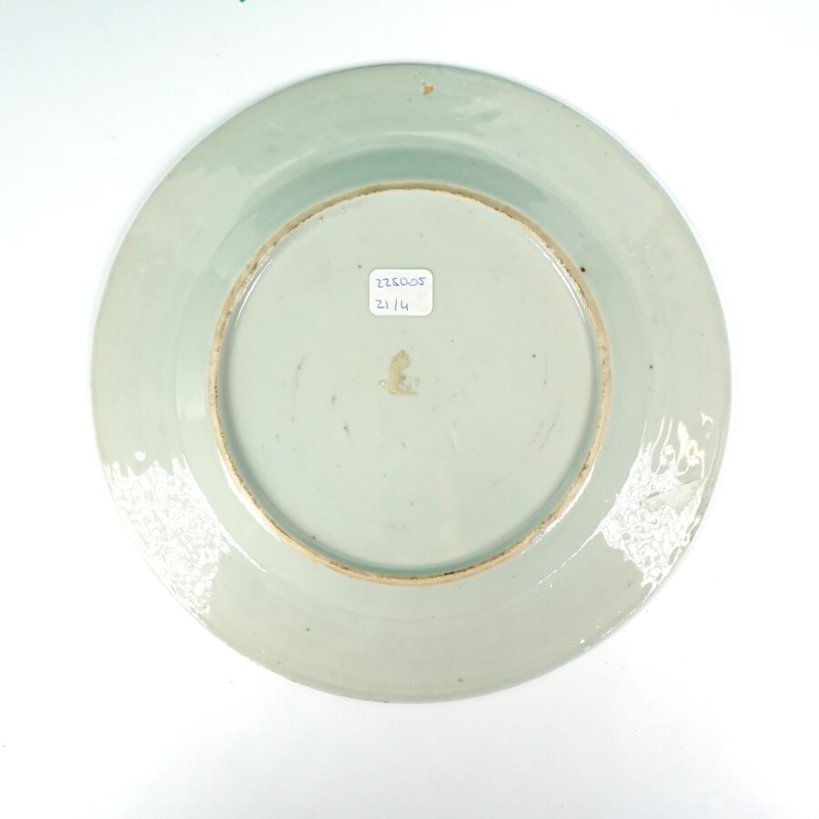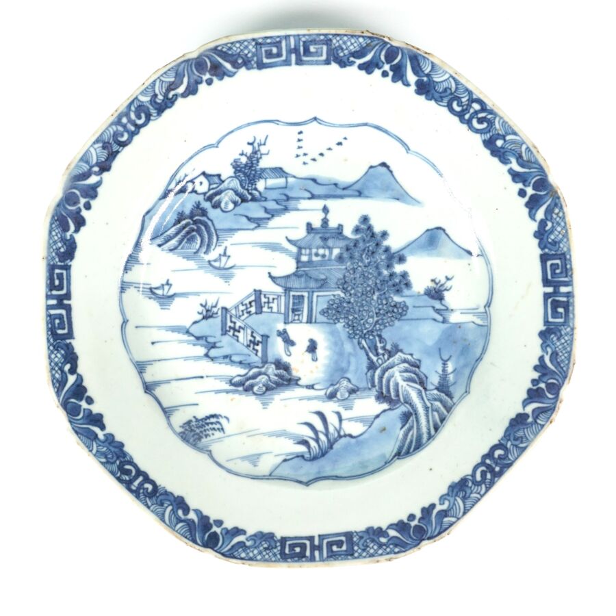 Assiette en porcelaine émaillée en bleu et blanc à décor d'un pavillon sur une île entourée de pics montagneux, Chine, Compagnie des Indes, 18ème siècle, D. 23 cm (égrenures).