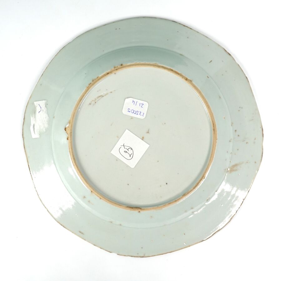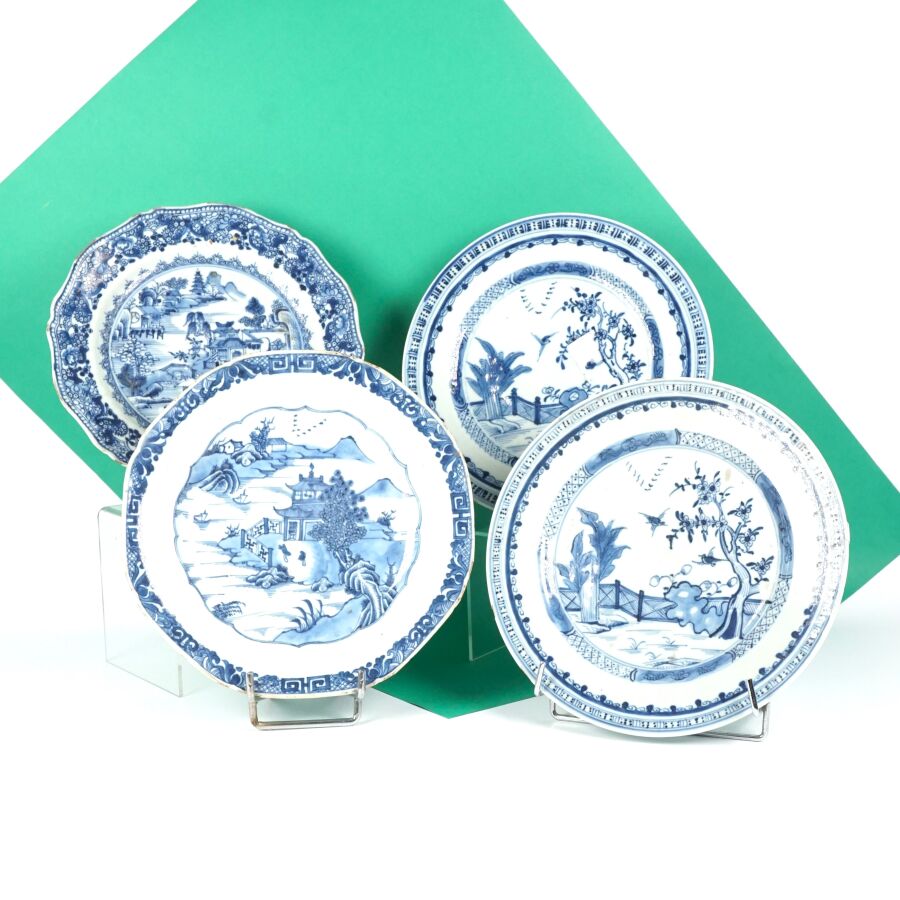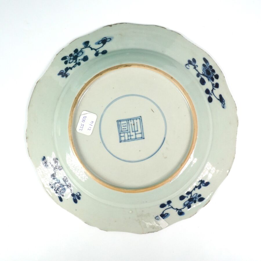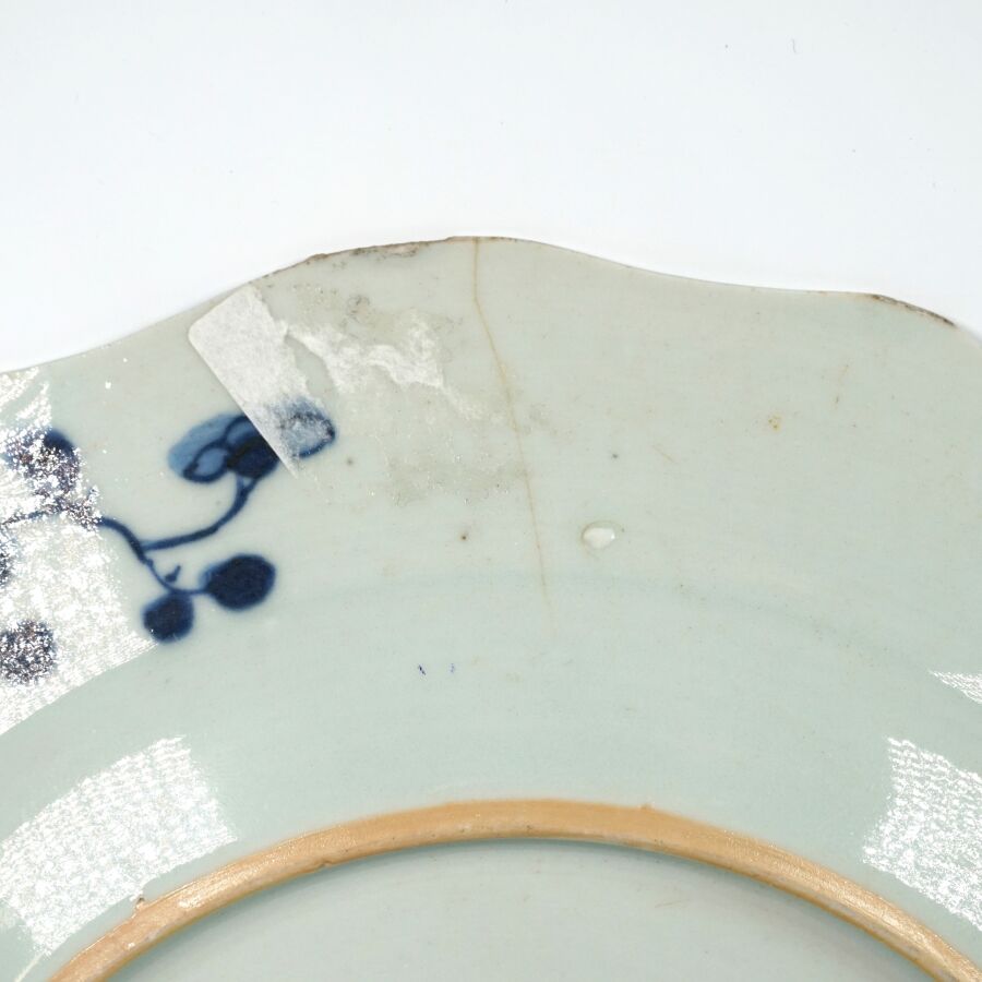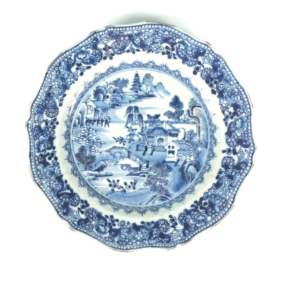 - Assiette floriforme en porcelaine émaillée en bleu, à décor d'une scène lacustre, l'aile ornée de feuilles et de tiges feuillagées, Chine, Compagnie des Indes, 18ème siècle, D. 23 cm (fêles).