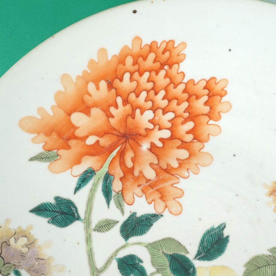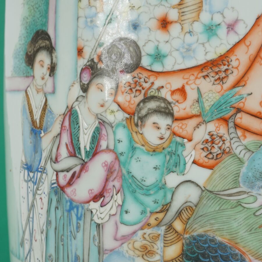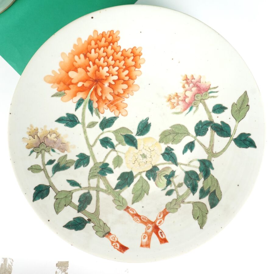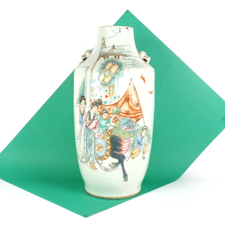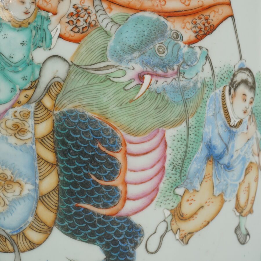 Ensemble en porcelaine et émaux de la famille rose comprenant un vase de forme balustre à décor de personnages chevauchant un dragon (H. 47 cm) et un plat rond à décor en plein de fleurs, Chine (D. 34,5 cm) (col coupé).