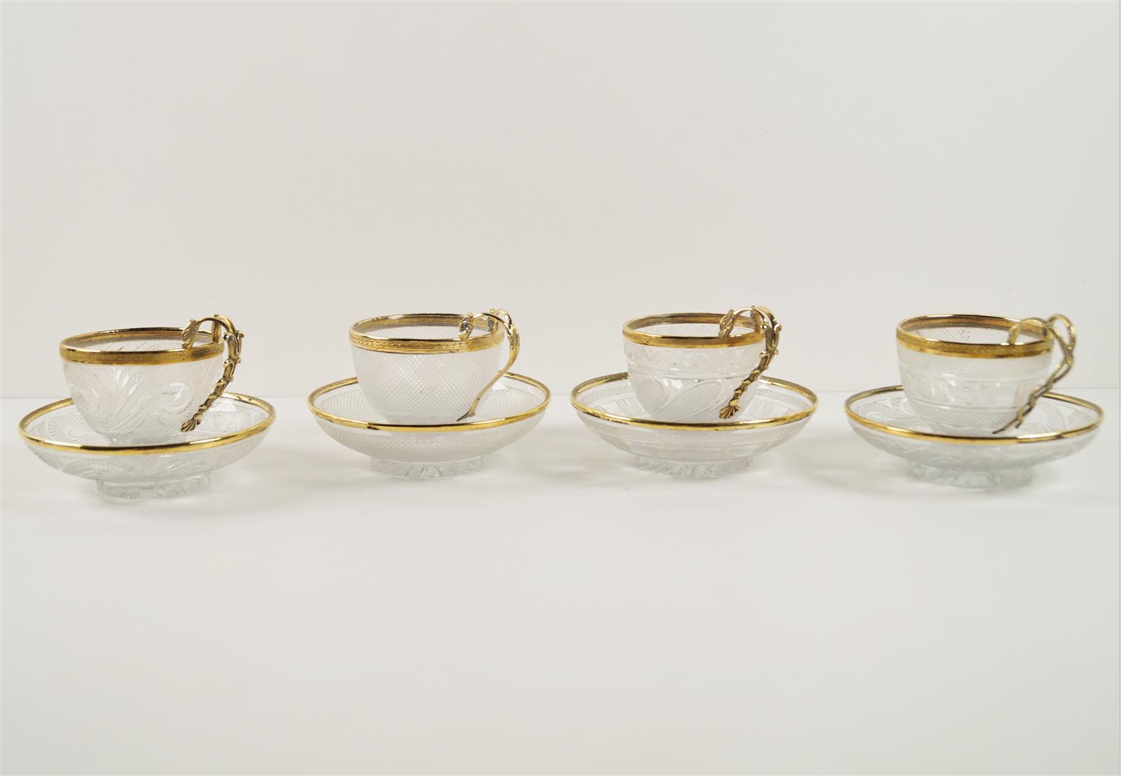 Ensemble en verre taillé en pointe de diamant et monture en métal doré à décor de frise de palmettes comprenant 4 tasses et leurs sous-tasses, une coupe sur piédouche, une burette et un flacon, 20e siècle. H. 15 et 16 cm., D. tasse : 7.5 cm (une tasse avec une anse différente)