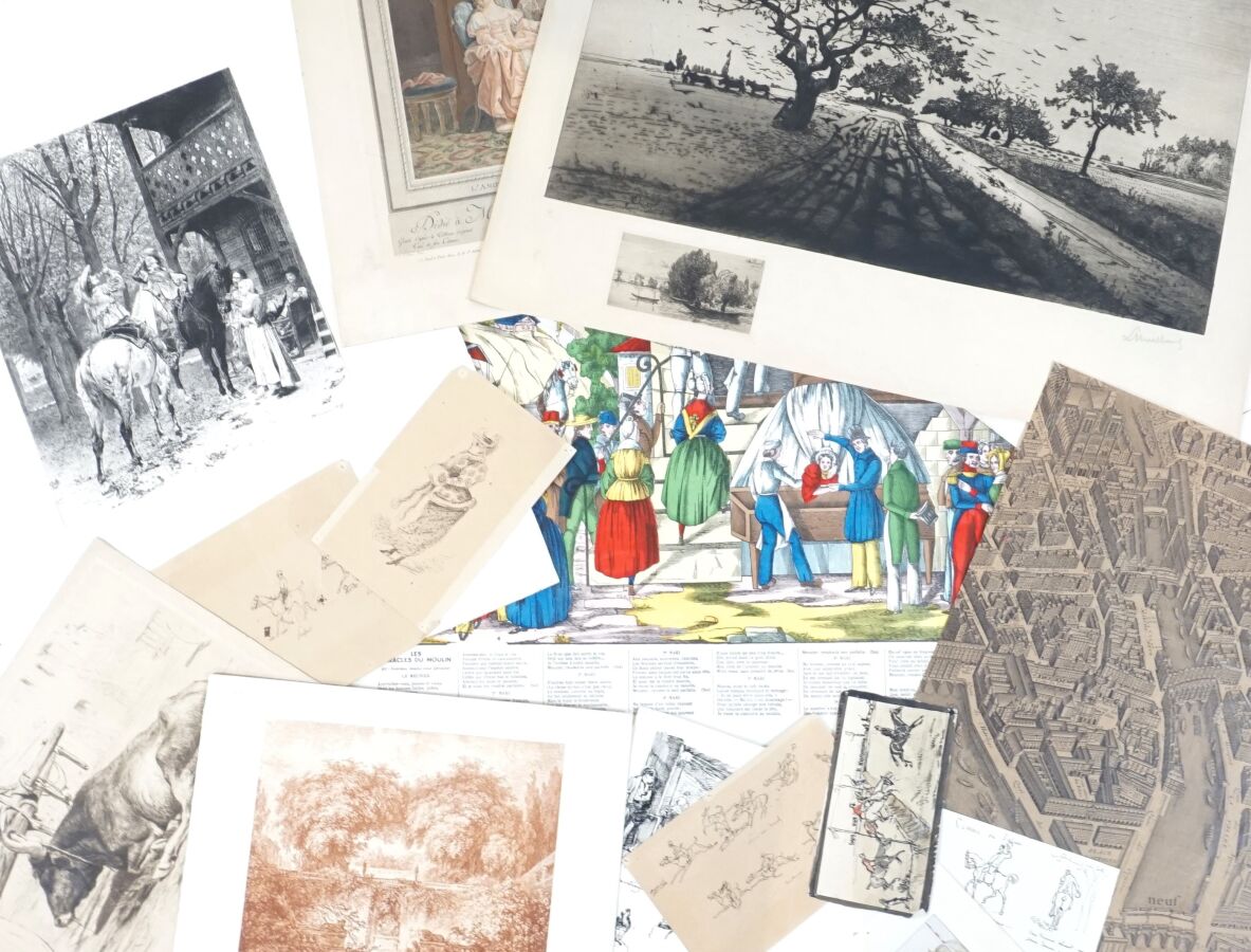 Environ quinze estampes diverses dont scènes d'intérieur, vue de Versailles, plan de ville, etc. de 4,5 x 11,5 à 32,5 x 52,5 cm, (en l'état).