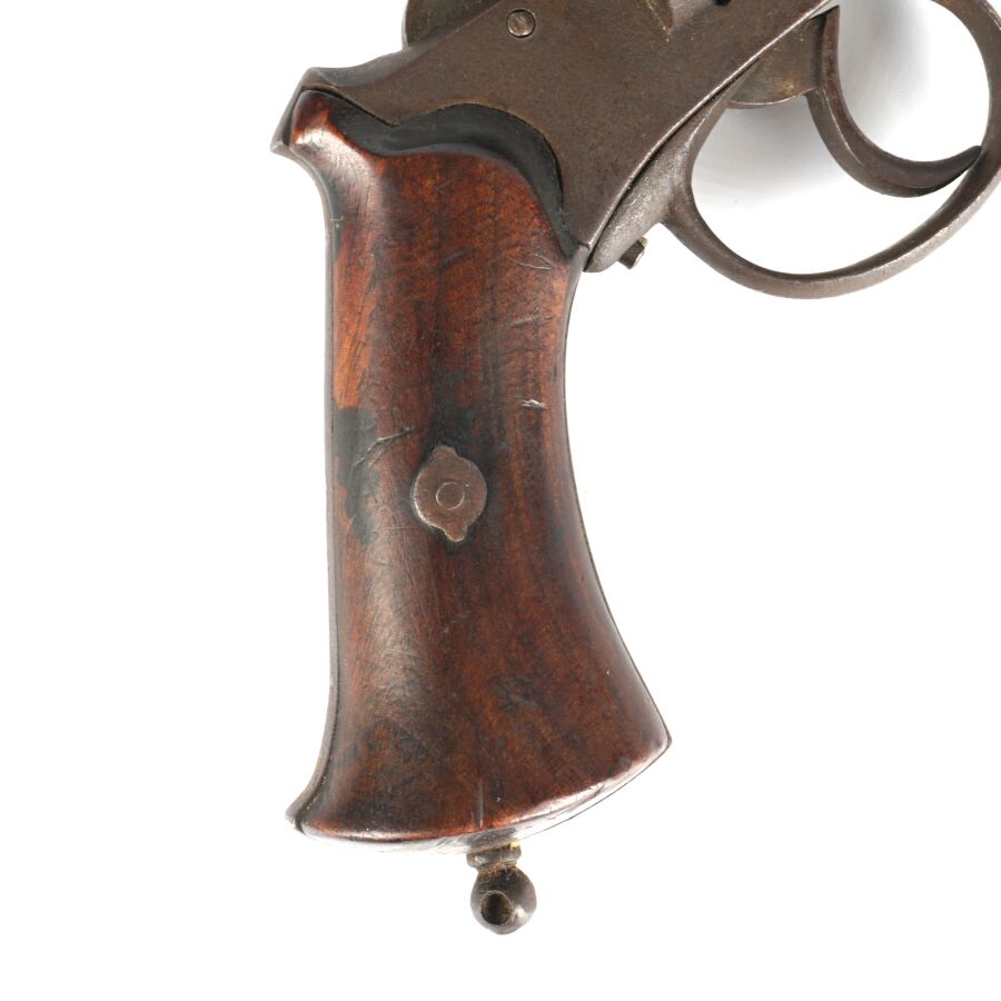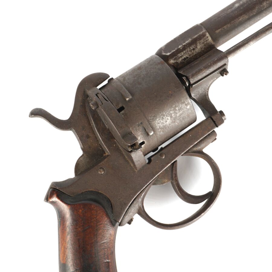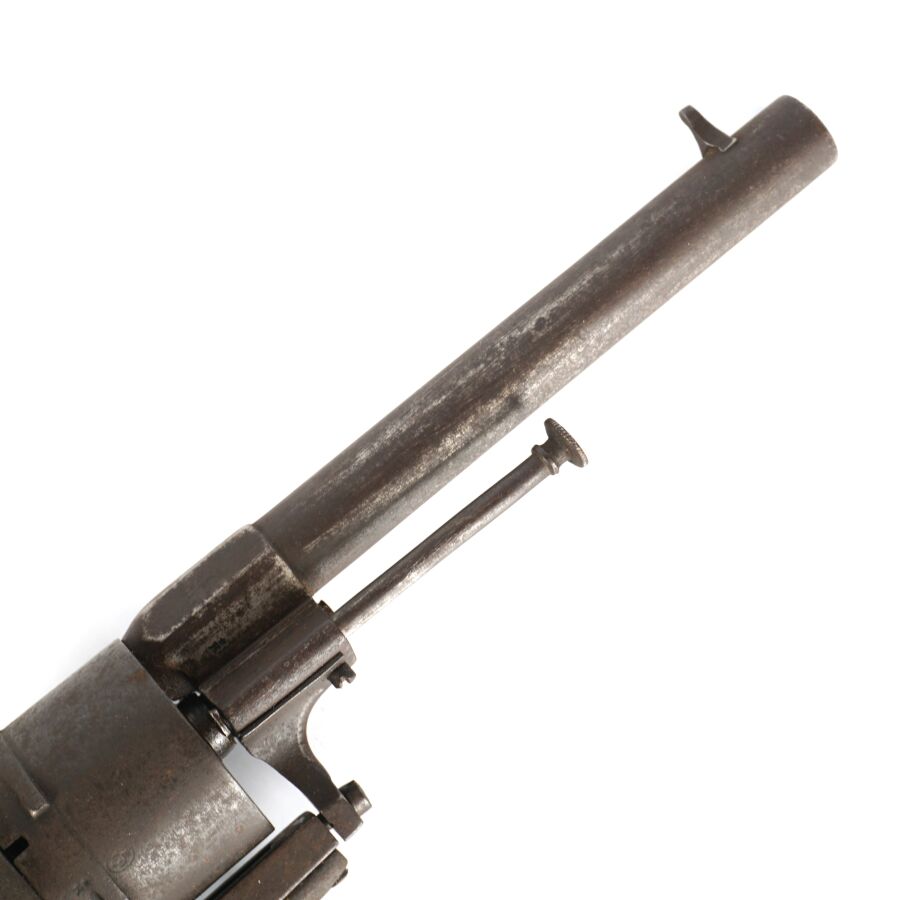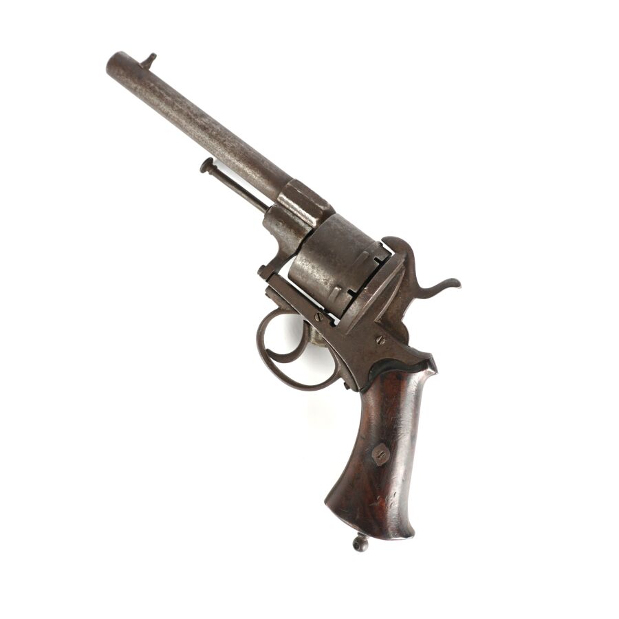Épave de REVOLVER A BROCHE, calibre 12 mm, 6 coups, double action, carcasse ouverte en acier bronzé, canon rond de 15 cm, tige d'extraction, plaquettes de la poignée en noyer, anneau de calotte, mécanisme non fonctionnel (indexation barillet et mécanisme du chien et de la détente à revoir), longueur totale : 27 cm, DANS L'ETAT.