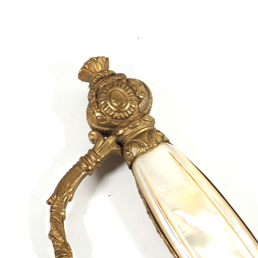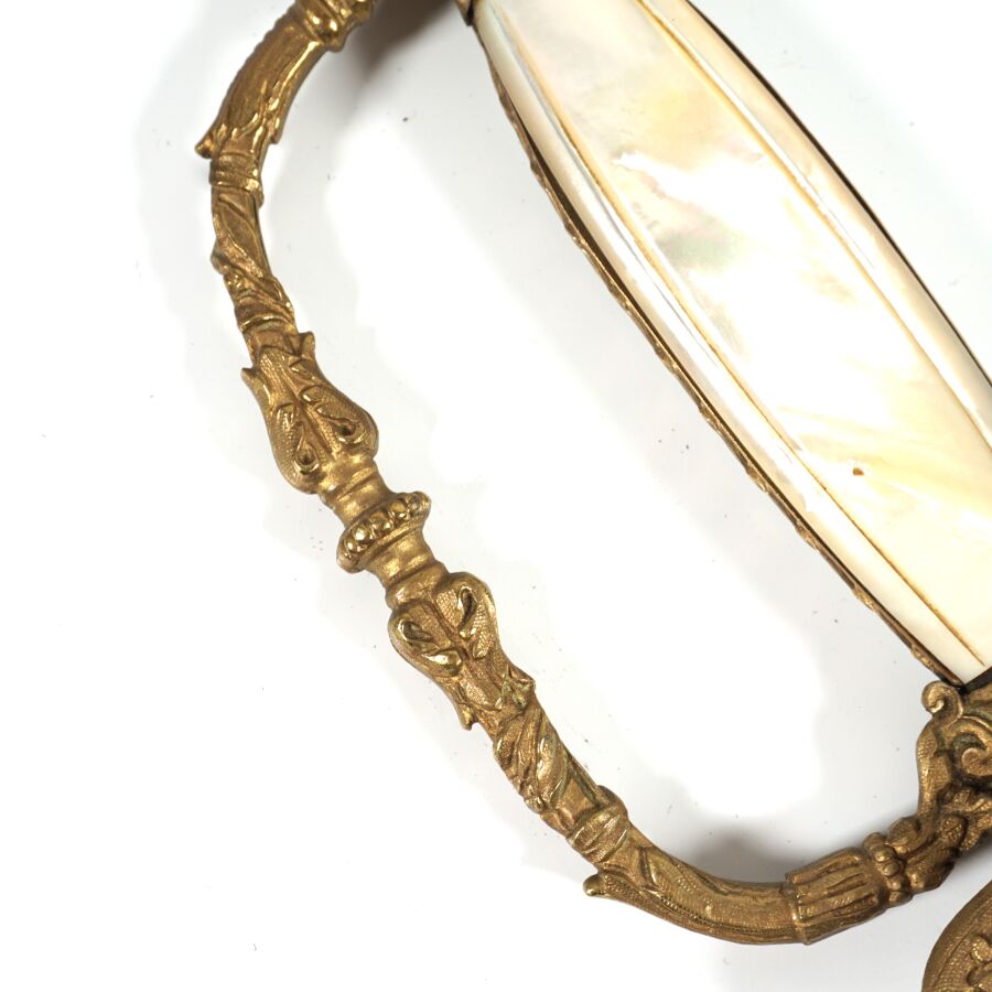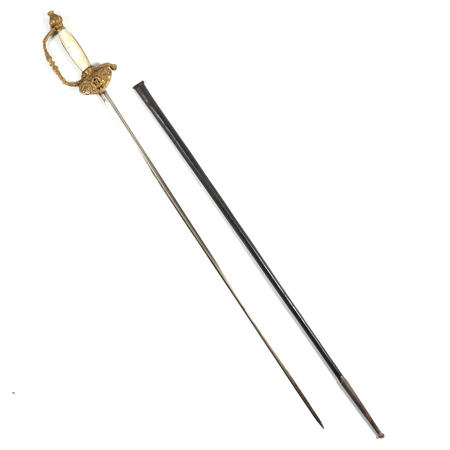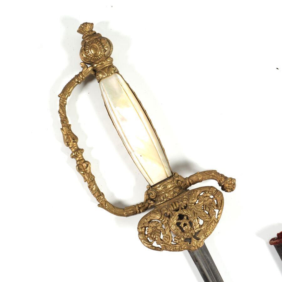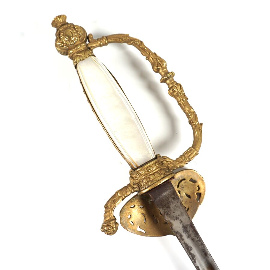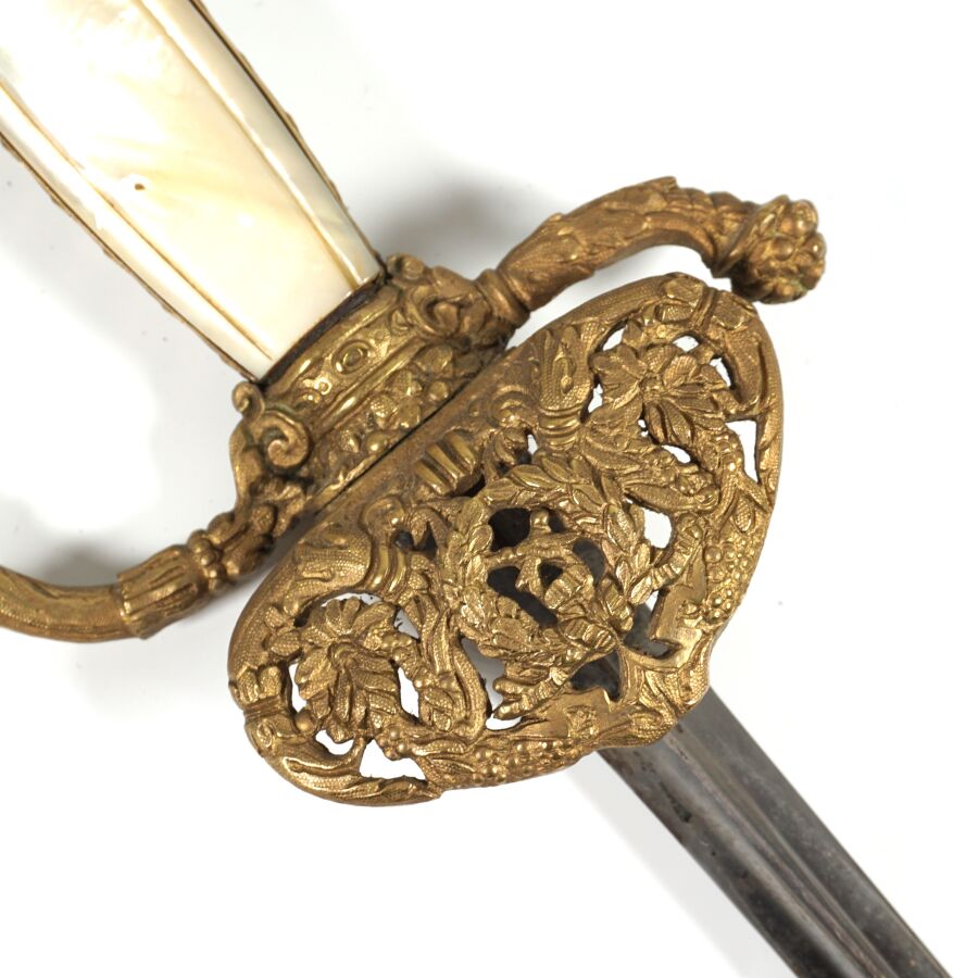 EPEE DE FONCTIONNAIRE CIVIL III REPUBLIQUE, monture ciselée en laiton doré à branche richement décorée de feuilles d'acanthe, pommeau à décor de palmettes et de soleil rayonnant, fusée en bois et plaquettes de nacre et bandes de laiton doré à décor de feuilles de laurier, clavier ajouré à décor d'une couronne civique, de cornes d'abondance et feuillage. Lame de 81 cm de section triangulaire à pans évidés, fourreau non conforme en cuir noir sans chape, ABE/BE.