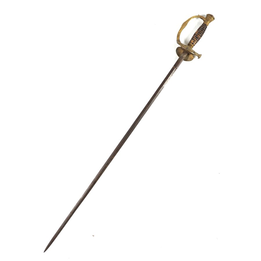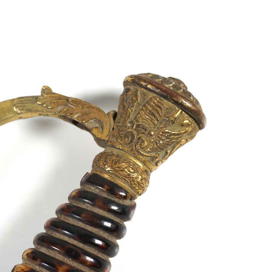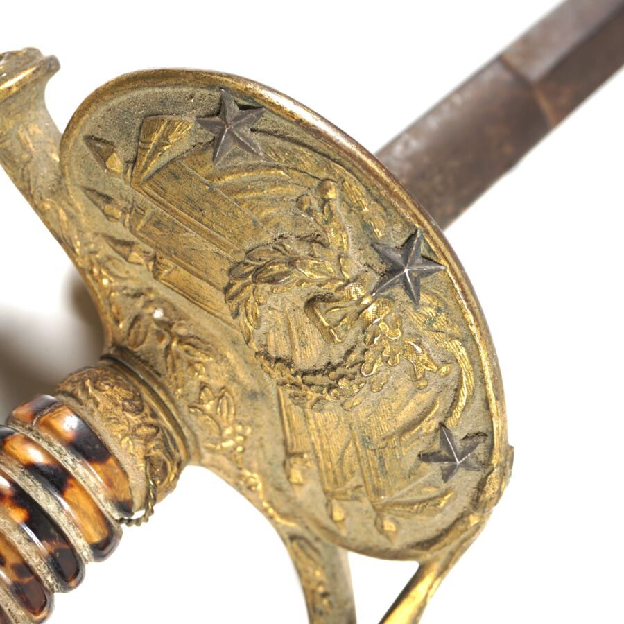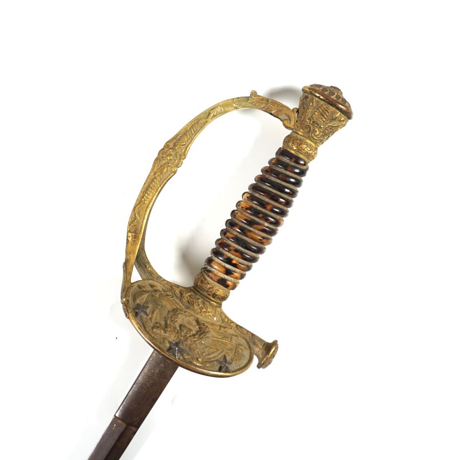 EPEE DE GENERAL DE DIVISION TYPE 1817 A CISELURE III REPUBLIQUE, monture en laiton doré et ciselé à une branche, fusée en bois gainée imitation écaille sans filigrane (manque), clavier à la couronne de laurier sur faisceau de six drapeaux avec trois étoiles en argent, contre clavier ciselé mobile à pompe, petit quillon droit en coquille, lame droite piquée de 83.5 cm de section losangique, sans fourreau, léger jeu, début XXème, BE.