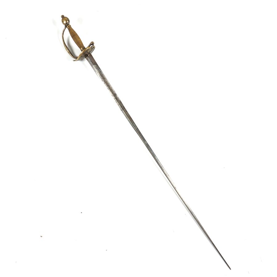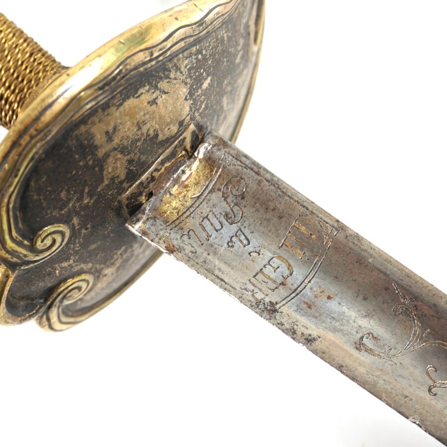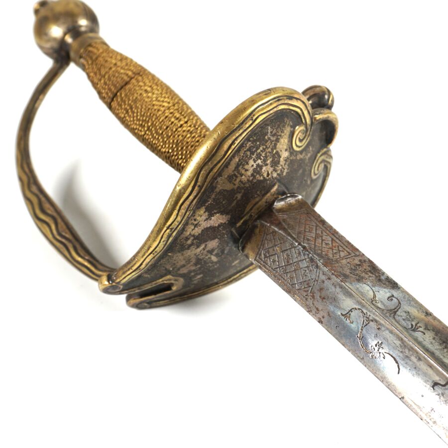 EPEE DES GARDES DU CORPS DE LA MAISON DU ROI POUR LE SERVICE A PIED, monture en bronze à une branche avec traces d'argenture à décor de traits ondulés, fusée en bois entièrement filigranée, croisière à médaillon ovale, pommeau ovale, plateau à coquille bivalve. Lame de 81 cm de section triangulaires à pans évidés gravée au premier tiers de trophées d'armes, marquée au talon " LIGER / A / PARIS ", sans fourreau, époque Louis XVI ou Restauration, ABE.