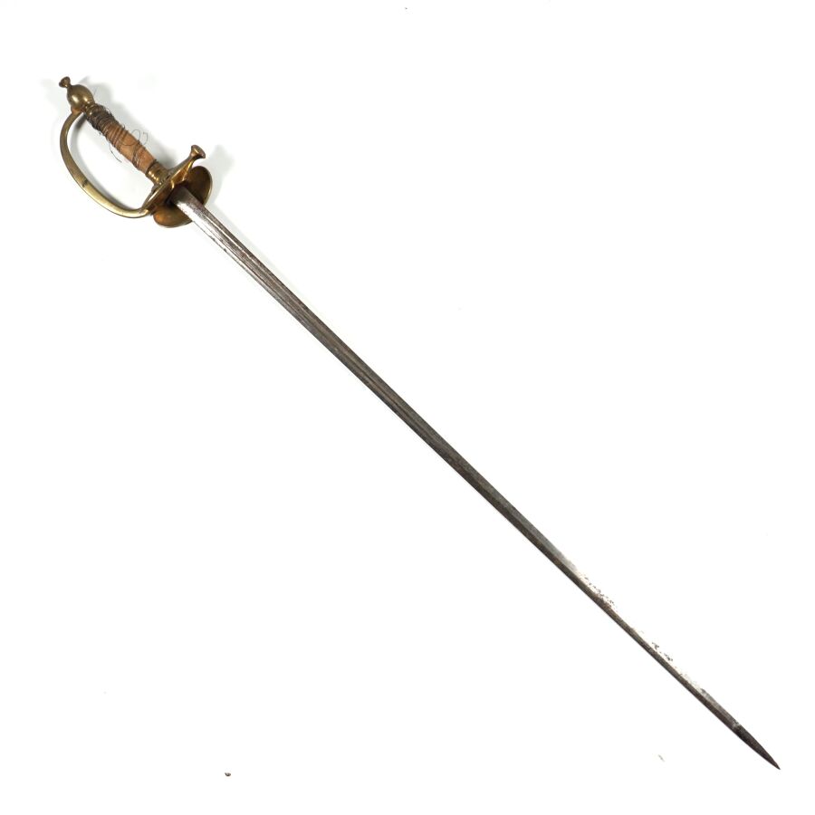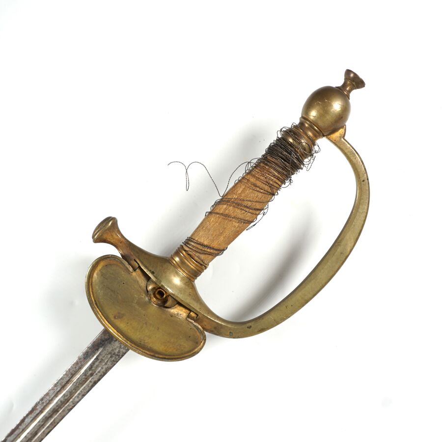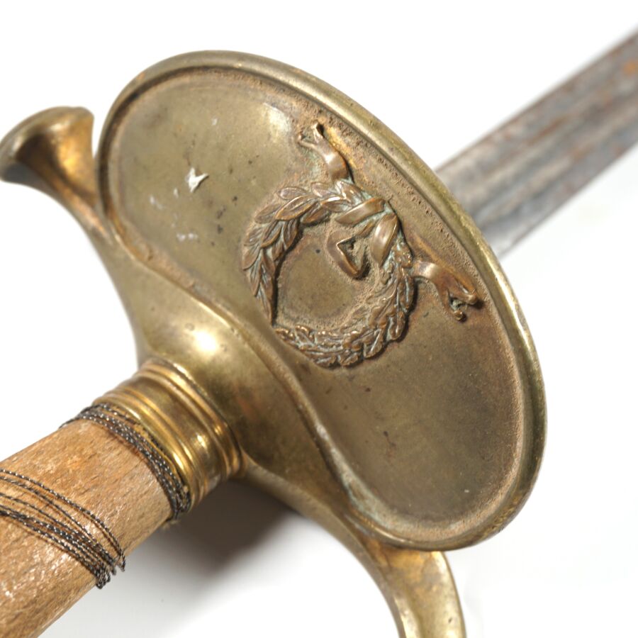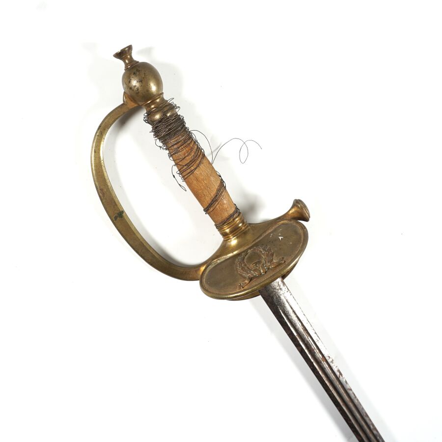 EPEE D'OFFICIER TOUT CORPS D'ARMEE III REPUBLIQUE, monture à une branche plate en laiton à clavier à décor d'une couronne de feuilles de chêne et de laurier, contre clavier à pompe, fusée en bois en mauvais état. Lame piquée de 80 cm à double gouttières, sans fourreau, DANS L'ETAT.