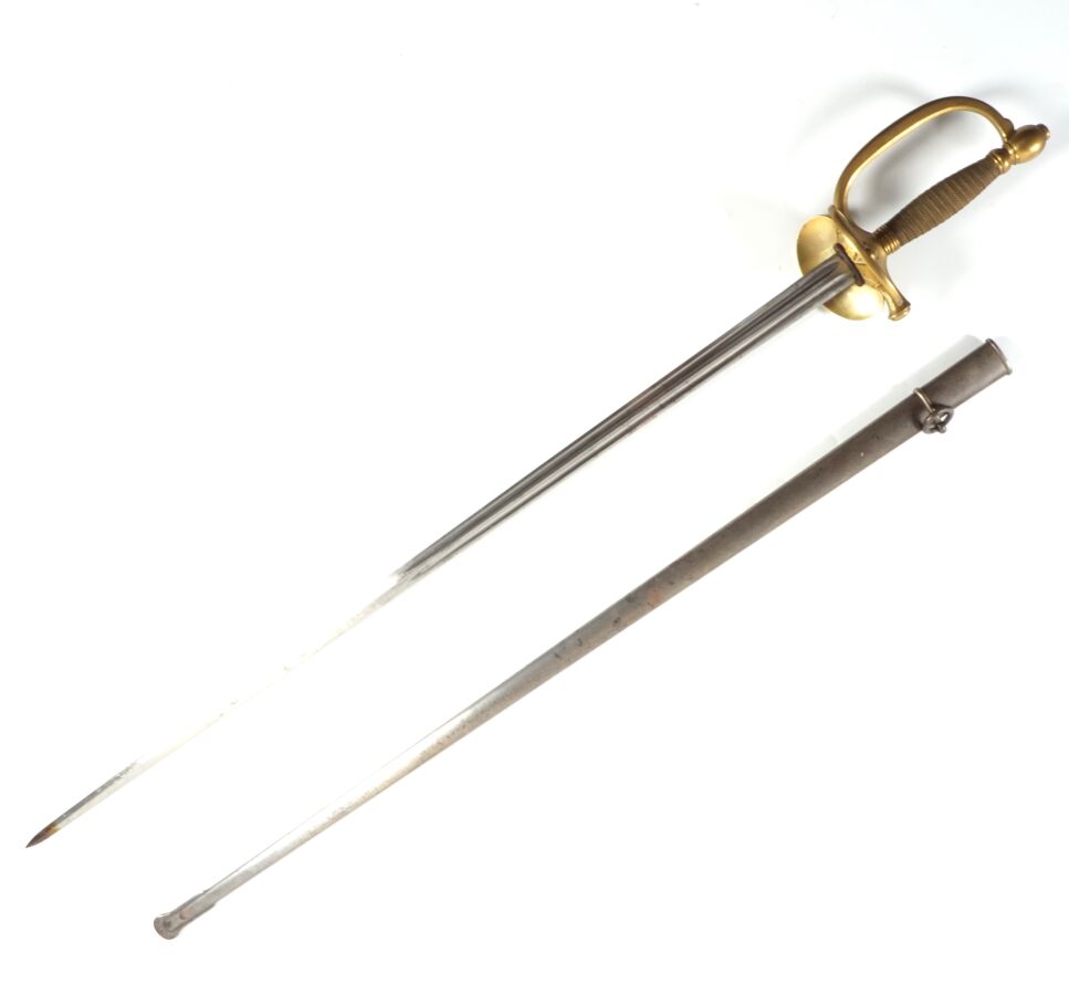 EPEE MODELE 1884 DE SOUS-OFFICIER D'INFANTERIE, monture en laiton sans ciselures à une branche plate, fusée en bois entièrement filigranée, pommeau diabolo, clavier à décor d'une grenade d'infanterie, conte-clavier à pompe, petit quillon droit. Lame piquée de 81 cm à double tranchant et deux gouttières, marquée au talon sur deux lignes " Mre d'Armes de Châtxbre 1892 / Epée de S.O. Mle 1884 ", fourreau en tôle un bracelet et anneau de suspente, III République, EM.