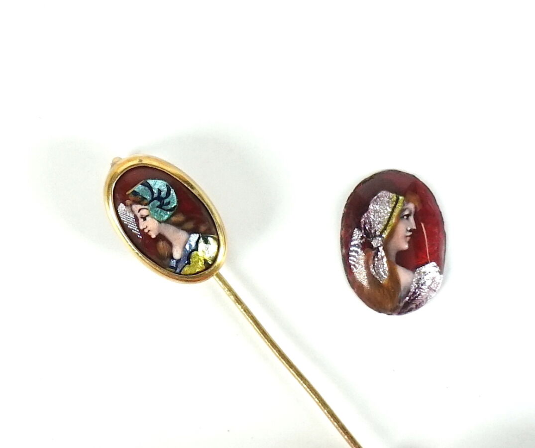 Epingle en or jaune 18K (750/oo), agrémentée d'un médaillon à décor d'un profil de femme en émaux de Limoges, signé "Blanchet", L. 6 cm. Poids brut : 1.5 g environ.