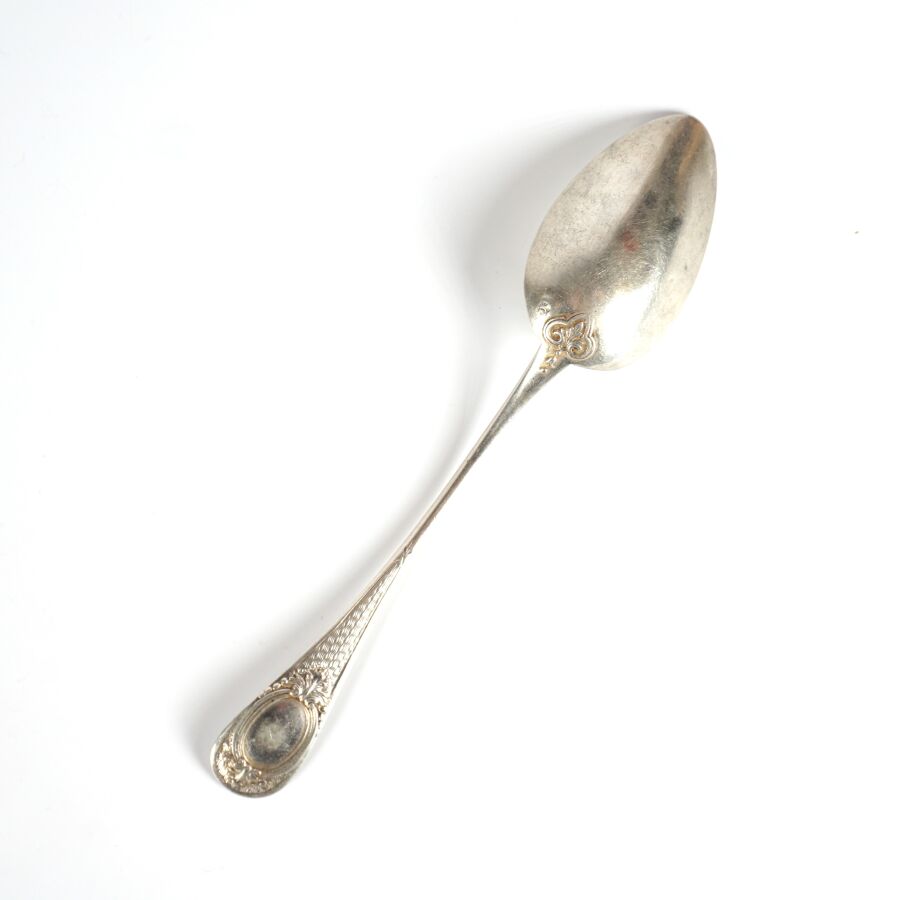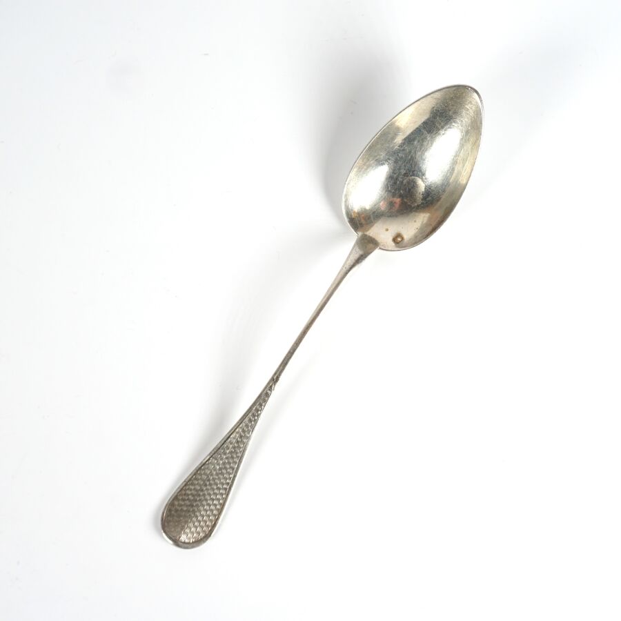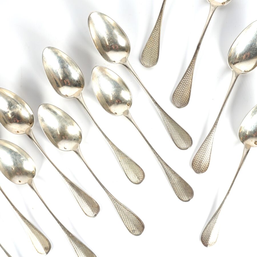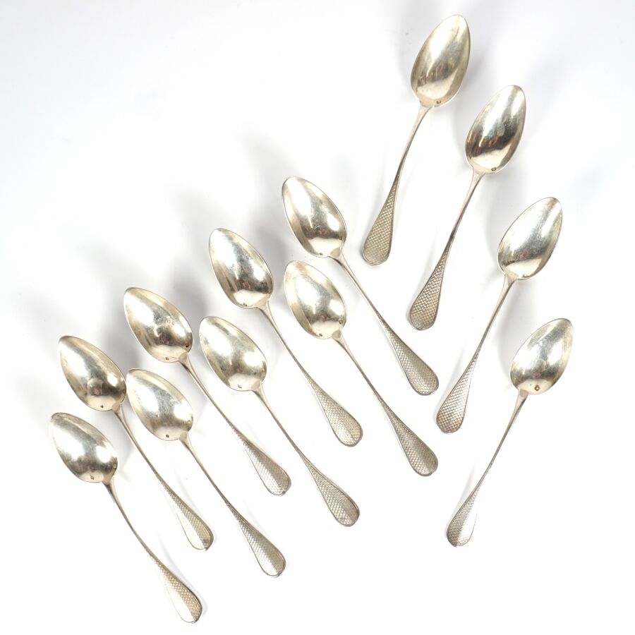 Ernest BUNET : Suite de douze cuillères à café en argent, poinçon Minerve 1er titre (950/oo), à décor guilloché, le revers du manche orné d'un cartouche ovale encadré de feuillages, Poids brut : 255 g environ.