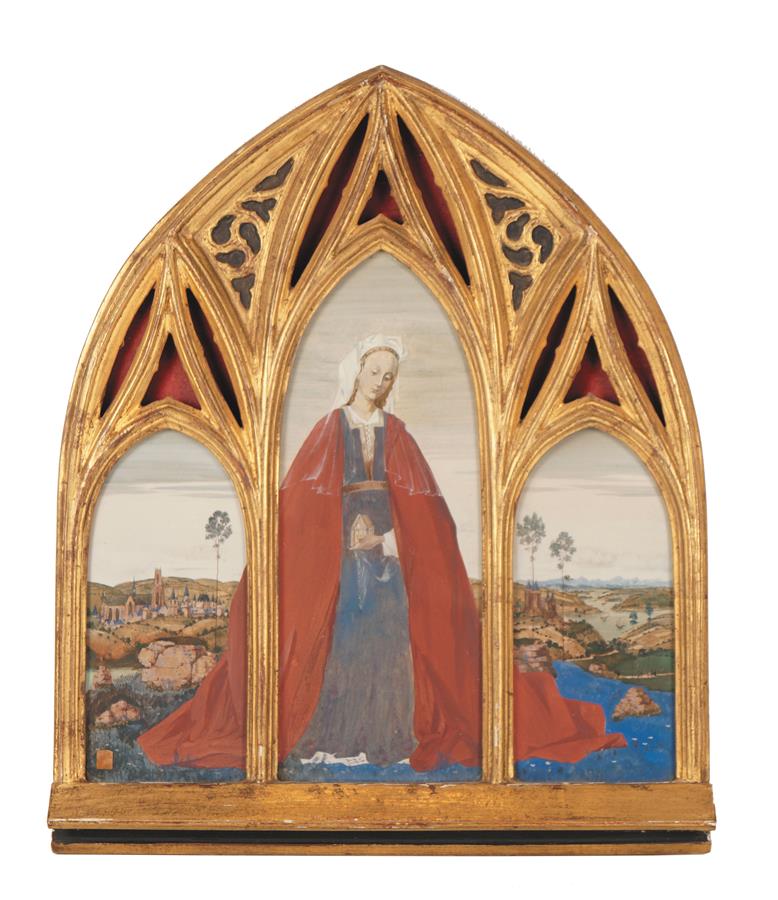 Ernest Pierre GUÉRIN (1887-1952), "La fille du Roi Arthur", gouache sur papier, signée en bas à droite sur le manteau, 23.5 x 26 cm (à vue). Présentée dans son cadre d'origine de style gothique à décor de croisée d'ogives, 35.5 x 29.3 cm.
