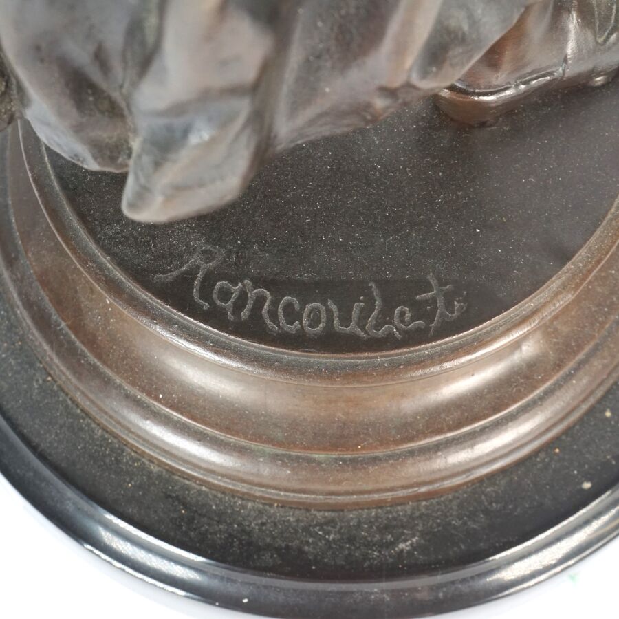 Ernest RANCOULET (1842-1918), "Femme au panier", sculpture en bronze à patine brune, signée sur la terrasse et signée au dos sur le drapé, présentée sur un socle en marbre noir, H. Totale : 50 cm (éclats au marbre).