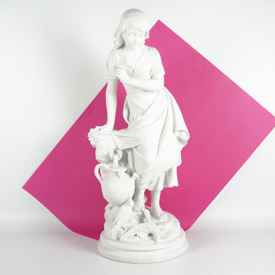 Ernest SPERLACKEN (XIX-XXe), "Jeune fille à la fontaine", sculpture en biscuit, signée sur la terrasse, H. 62 cm (éclat recollé au socle, restauration à un doigt).