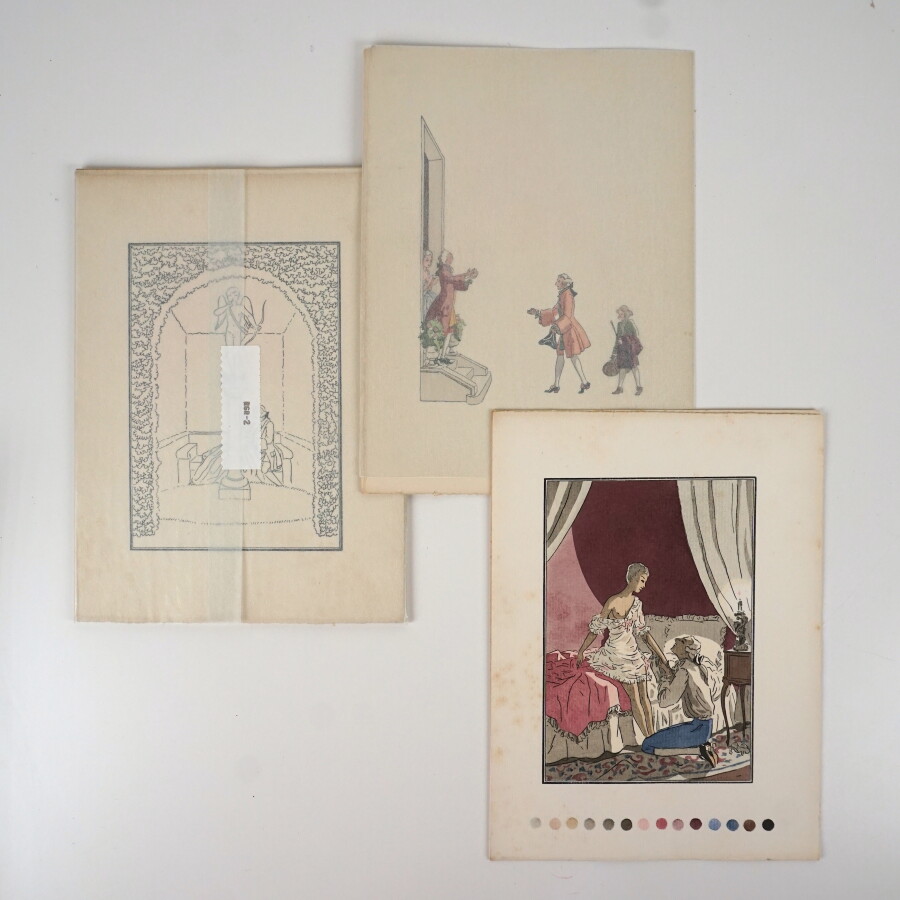 [EROTICA] - CASANOVA - Quelques aventures parisiennes - Angers ; Éditions Jacques-Petit, 1944 - 1 volume In-8° broché sous couverture rempliée (de menues restaurations) avec pièce de titre illustrée d'1 vignette en couleurs contre collée au 1er plat - Vignettes in texte et planches hors texte par Maurice Pouzet rehaussées à l'aquarelle au pochoir - Bon exemplaire hors commerce numéroté sur Arches (n°XXI sur les XXXV, tirage : 754 + 35) enrichi d'1 décomposition d'1 planche et de 2 illustrations refusées en feuilles.